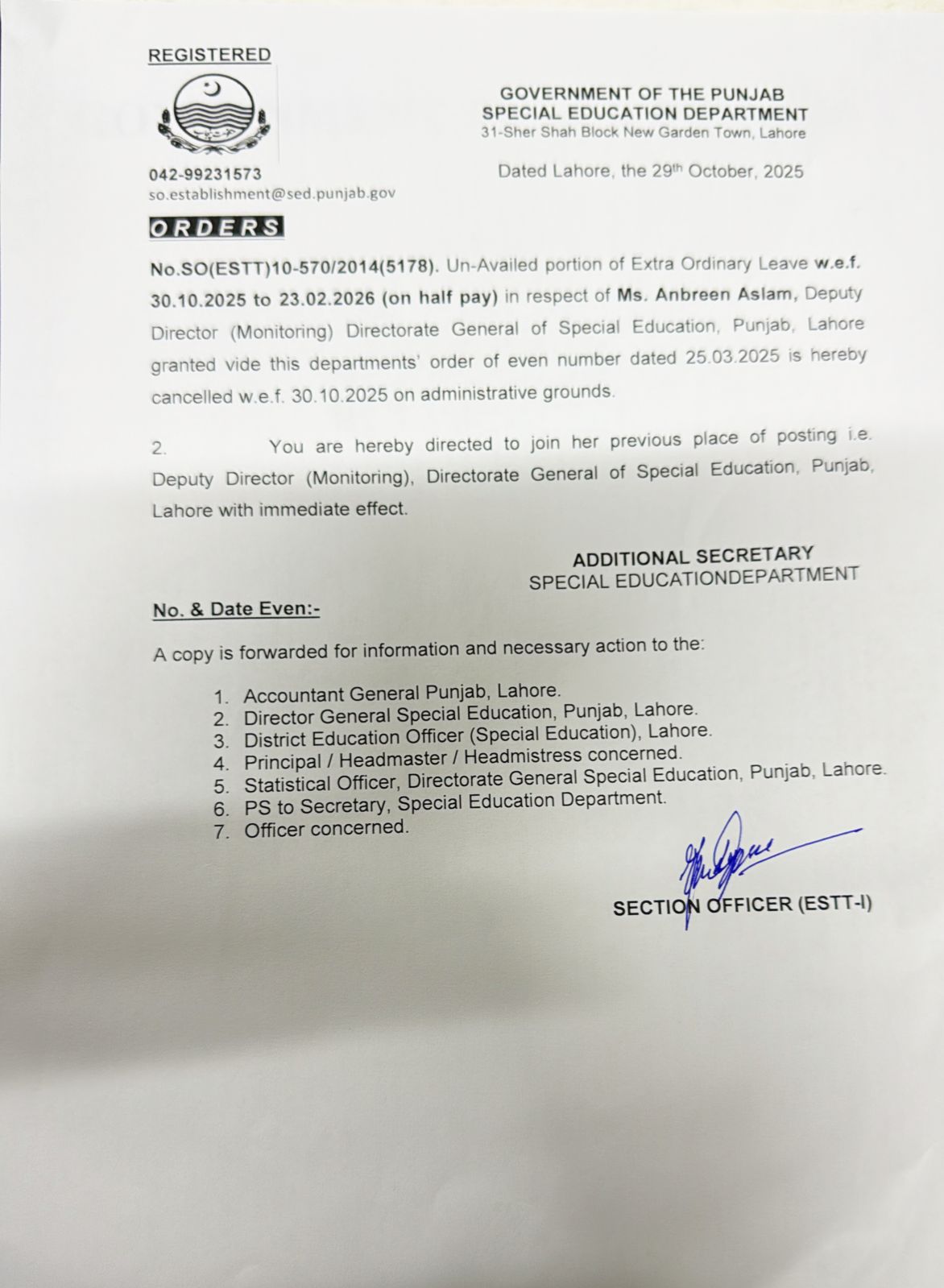 Cancellation of Extra Ordinary Leave |