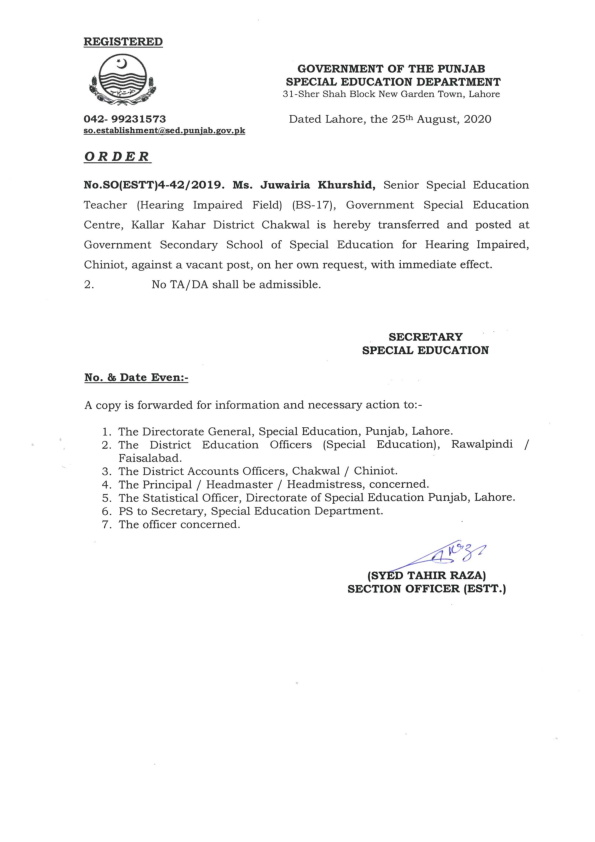 Category Transfer / Posting Orders Date Wednesday, August 26, 2020 - 12:00 Order No SO(ESTT.)4-42/2019 File javeria.png124.04 KB Employee Name Juwairia Khurshid