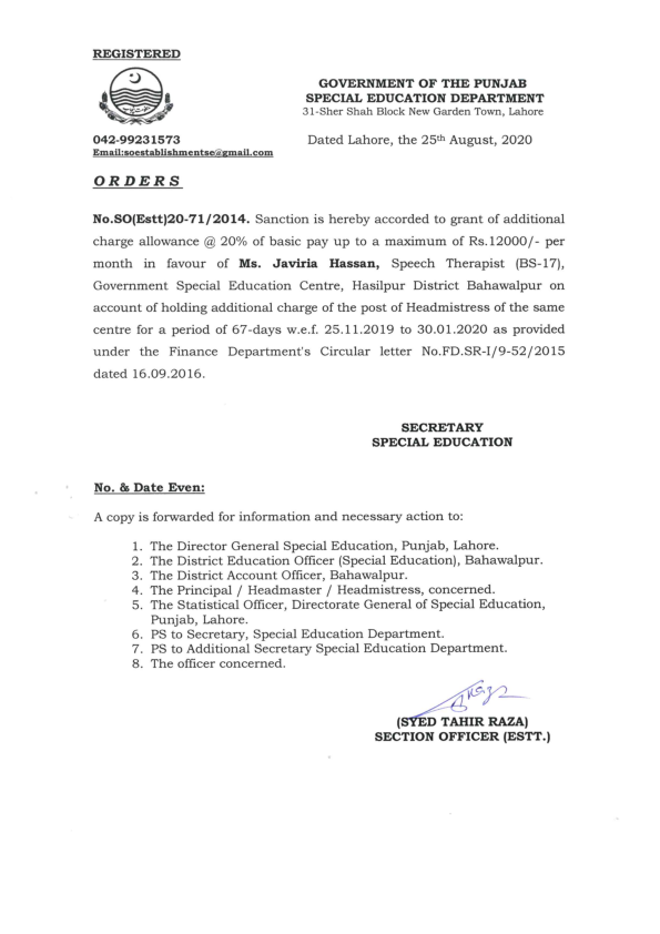 Category Additional Charge Orders Date Wednesday, August 26, 2020 - 12:00 Order No SO(ESTT.)20-71/2014 File javeria.png135.81 KB Employee Name Javiria Hassan