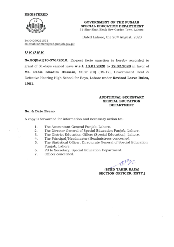Category Leave Orders Date Thursday, August 27, 2020 - 12:00 Order No SO(ESTT.)10-376/2010 File khadim.png116.33 KB Employee Name Rabia Khadim Hussain