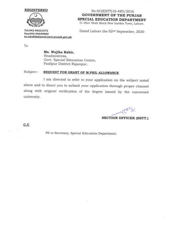 Category Higher Qualification Allowances Date Wednesday, September 2, 2020 - 12:00 Order No SO(ESTT.)10-485/2016 File wajiha.png85.75 KB Employee Name Wajiha Kabir