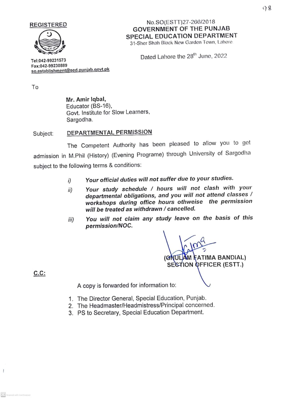 Category Departmental Permissions Date Thursday, June 30, 2022 - 12:00 Order No S0(ESTT.)27-266/2018 File WhatsApp Image 2022-06-30 at 3.09.47 PM.jpeg81.98 KB Employee Name Amir Iqbal Prominent Notifications