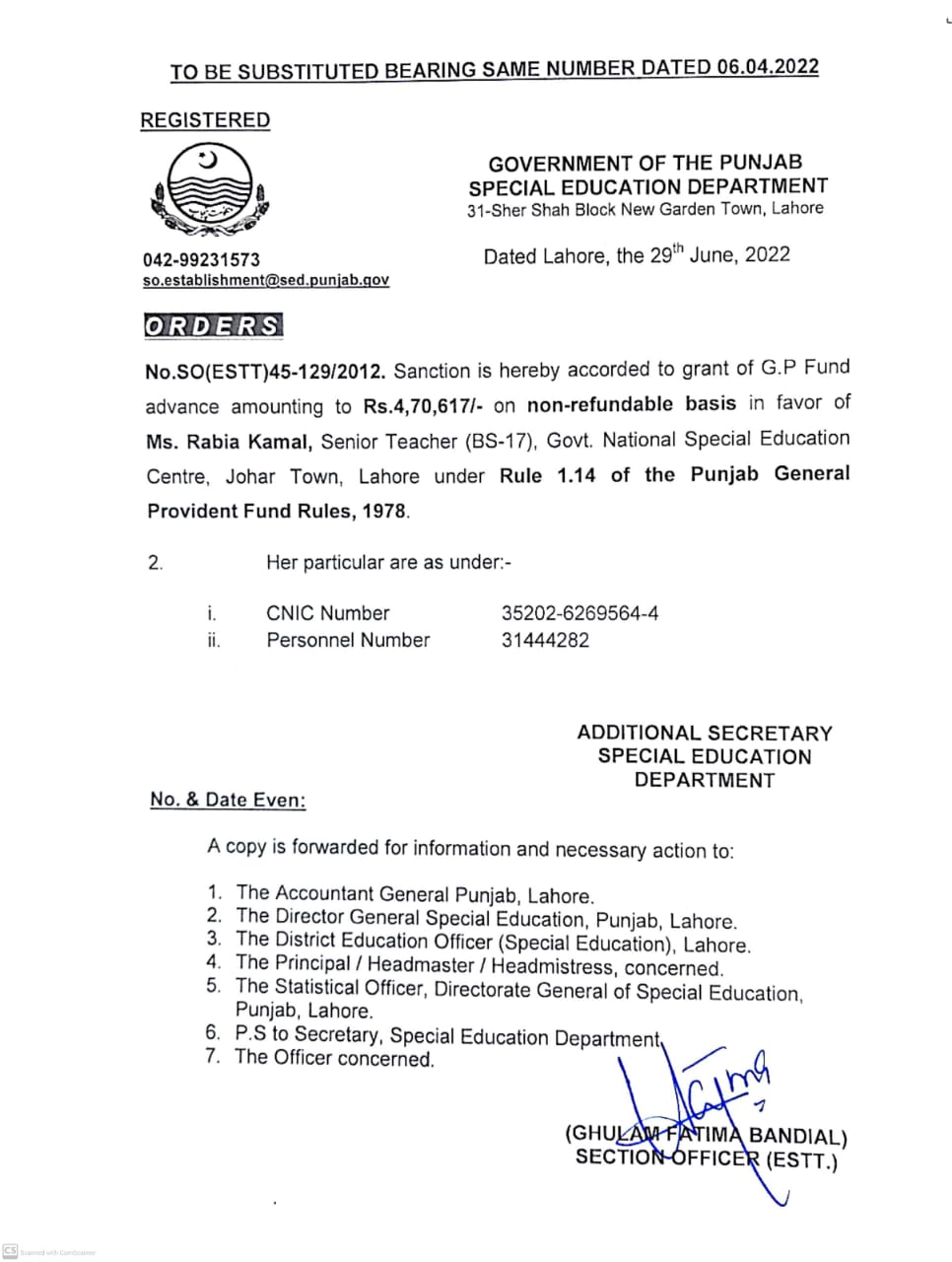 Category G.P Fund Advance Date Thursday, June 30, 2022 - 12:00 Order No S0(ESTT.)45-129/2012 File WhatsApp Image 2022-06-30 at 3.09.46 PM.jpeg100.69 KB Employee Name Rabia Kamal Prominent Notifications