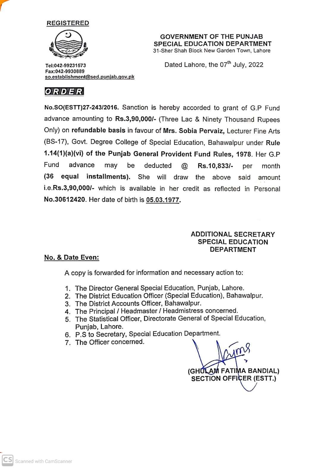 Category G.P Fund Advance Date Thursday, July 7, 2022 - 12:00 Order No S0(ESTT.)23-243/2016 File WhatsApp Image 2022-07-07 at 2.54.37 PM.jpeg126.89 KB Employee Name Sobia Pervaiz Prominent Notifications