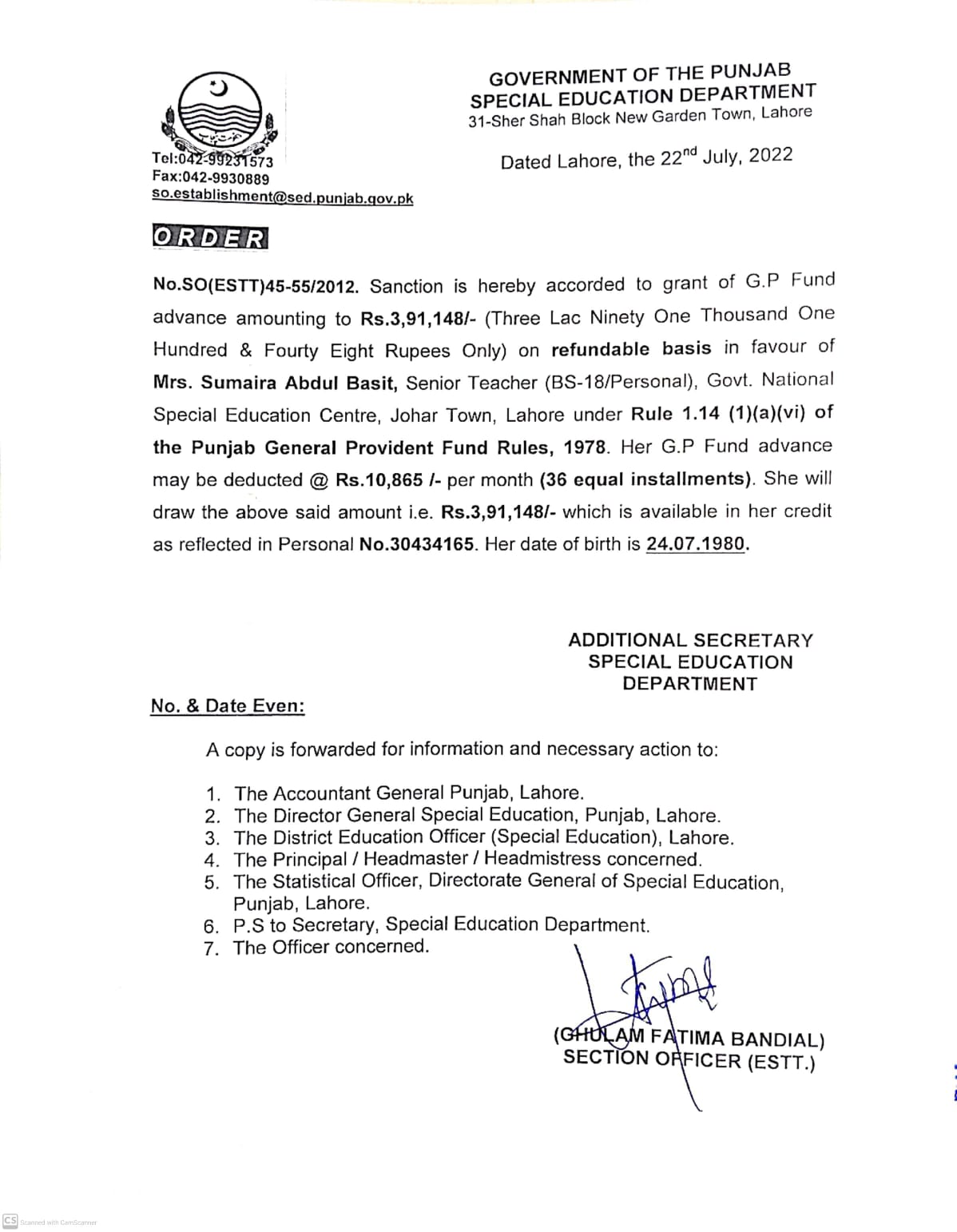 Category G.P Fund Advance Date Friday, July 22, 2022 - 12:00 Order No S0(ESTT.)45-55/2012 File WhatsApp Image 2022-07-22 at 12.39.13 PM.jpeg141.2 KB Employee Name Sumaira Abdul Basit Prominent Notifications