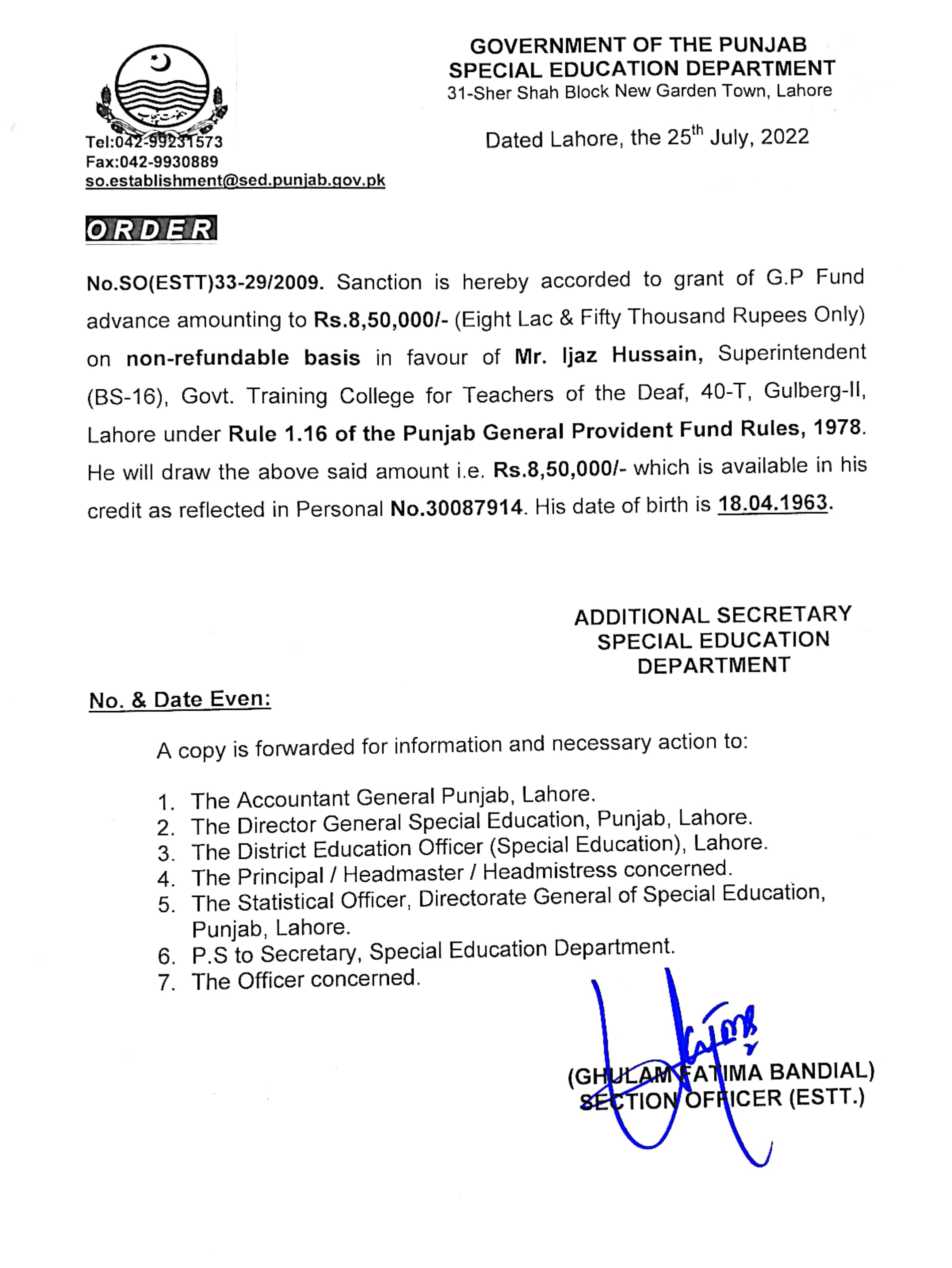 Category G.P Fund Advance Date Monday, July 25, 2022 - 12:00 Order No S0(ESTT.)33-29/2009 File CamScanner 07-27-2022 14.22_page4_image2.jpg589.64 KB Employee Name Ijaz Hussain Prominent Notifications