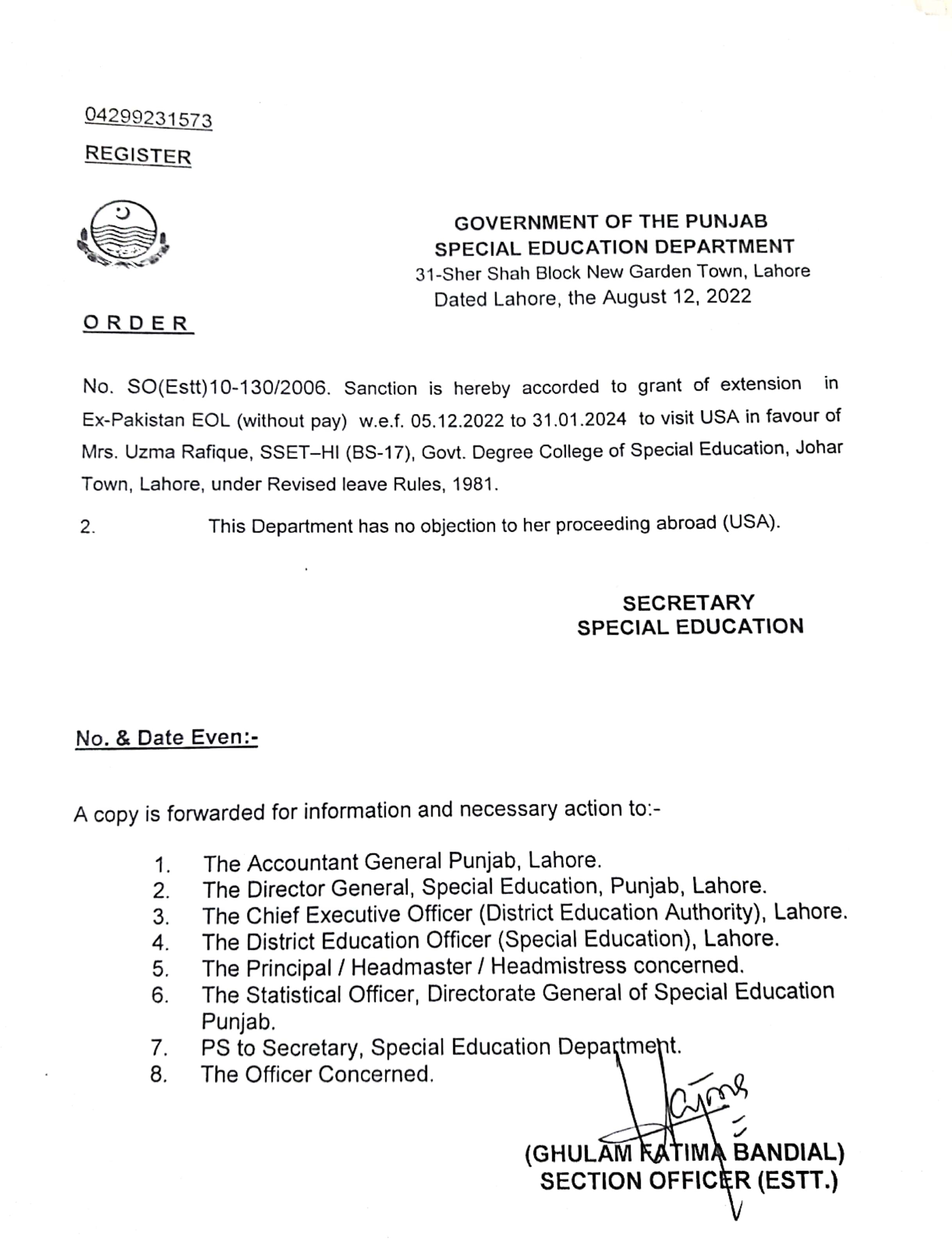 Category Leave Orders Date Friday, August 12, 2022 - 12:00 Order No S0(ESTT.)10-130/2006 File New Doc 08-15-2022 11.34_page3_image3.jpg488.46 KB Employee Name Uzma Rafique Prominent Notifications