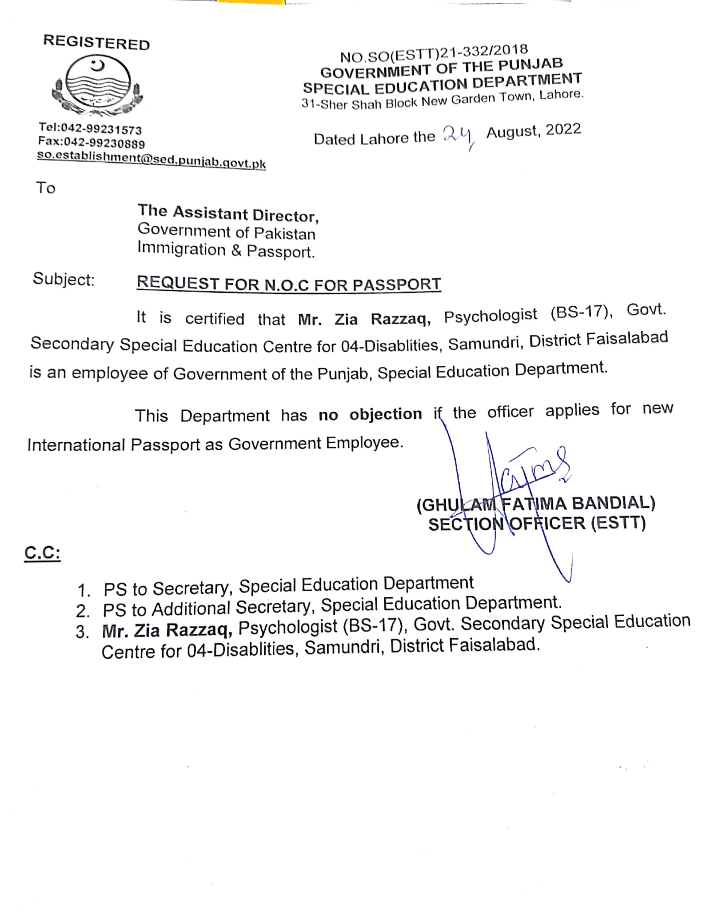 Category Departmental Permissions Date Wednesday, August 24, 2022 - 12:00 Order No S0(ESTT.)21-332/2018 File New Doc 08-24-2022 13.56_page11_image6.jpg460.63 KB Employee Name Zia Razzaq Prominent Notifications