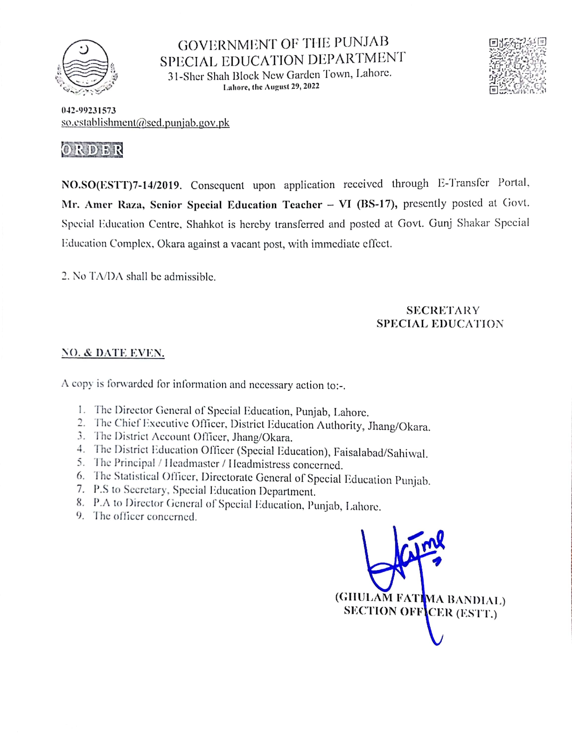 Category Transfer / Posting Orders Date Monday, August 29, 2022 - 12:00 Order No S0(ESTT.)7-14/2019 File CamScanner 08-24-2022 16.04 (2)_page10_image5_0.jpg441.42 KB Employee Name Amer Raza Prominent Notifications