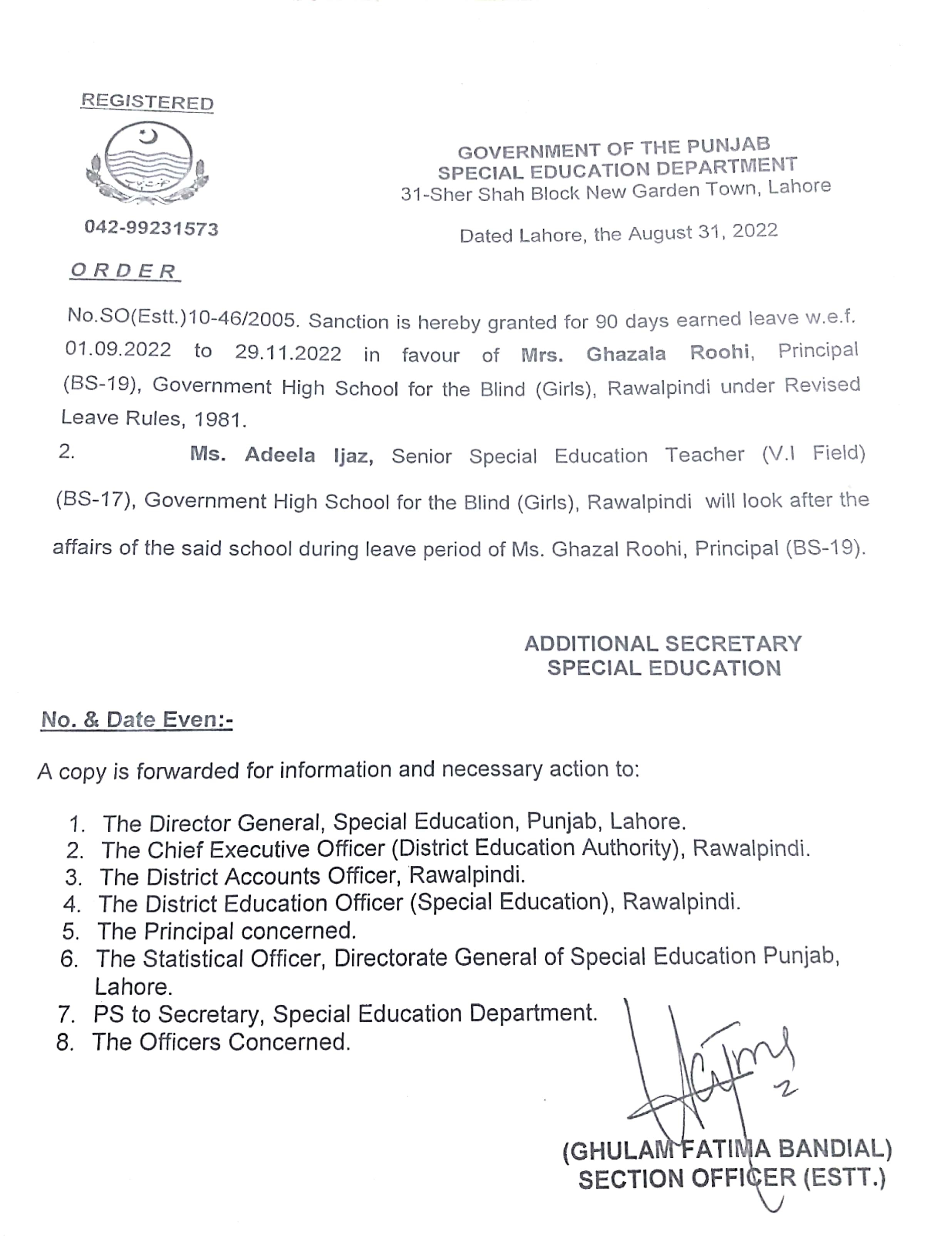 Category Leave Orders Date Thursday, September 1, 2022 - 12:00 Order No S0(ESTT.)10-46/2005 File New Doc 09-01-2022 15.37_page4_image4.jpg527.89 KB Employee Name Ghazala Roohi Prominent Notifications
