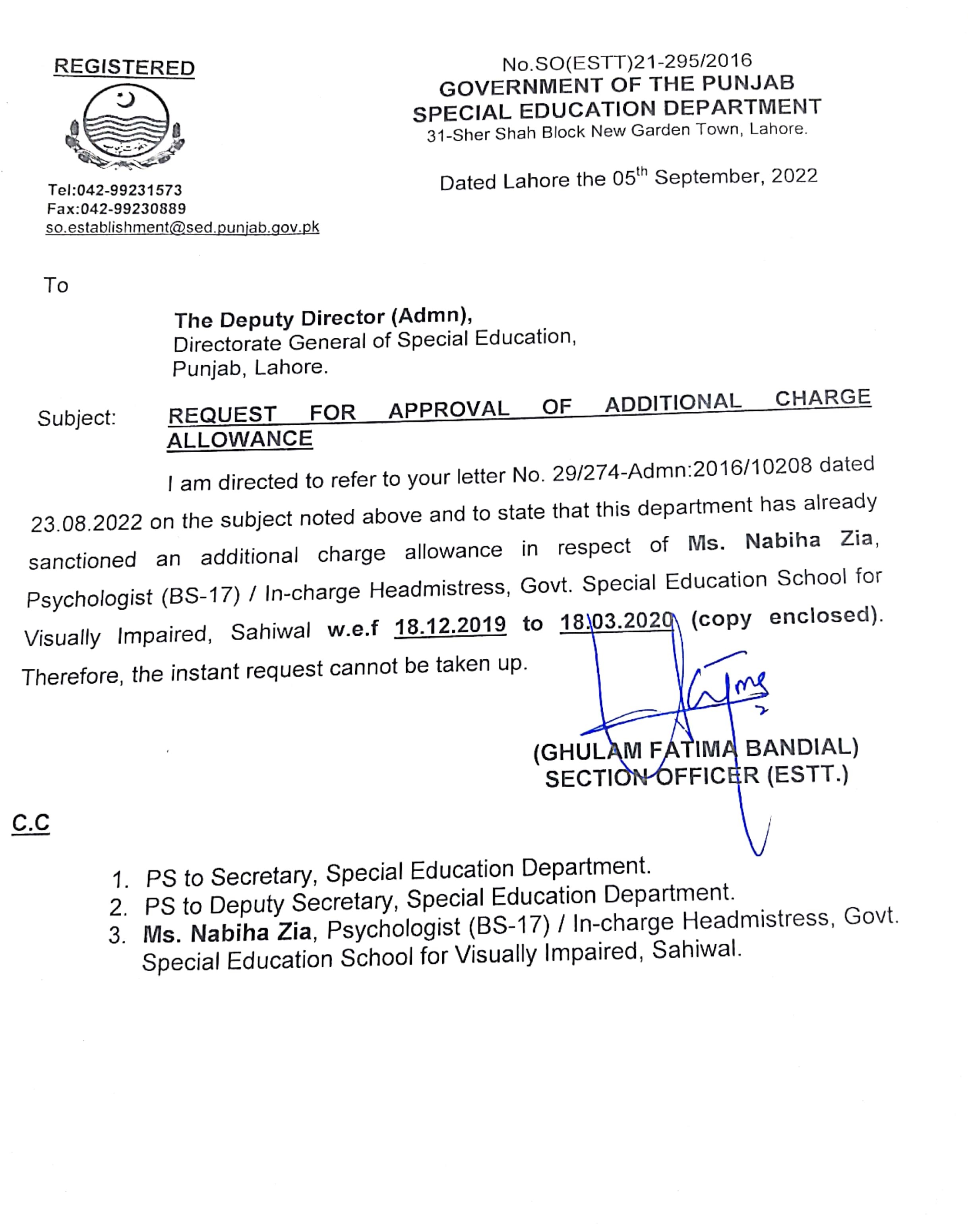 Category Additional Charge Orders Date Monday, September 5, 2022 - 12:00 Order No S0(ESTT.)21-295/2016 File New Doc 09-05-2022 15.38_page6_image4.jpg534.15 KB Employee Name Nabiha Zia Prominent Notifications
