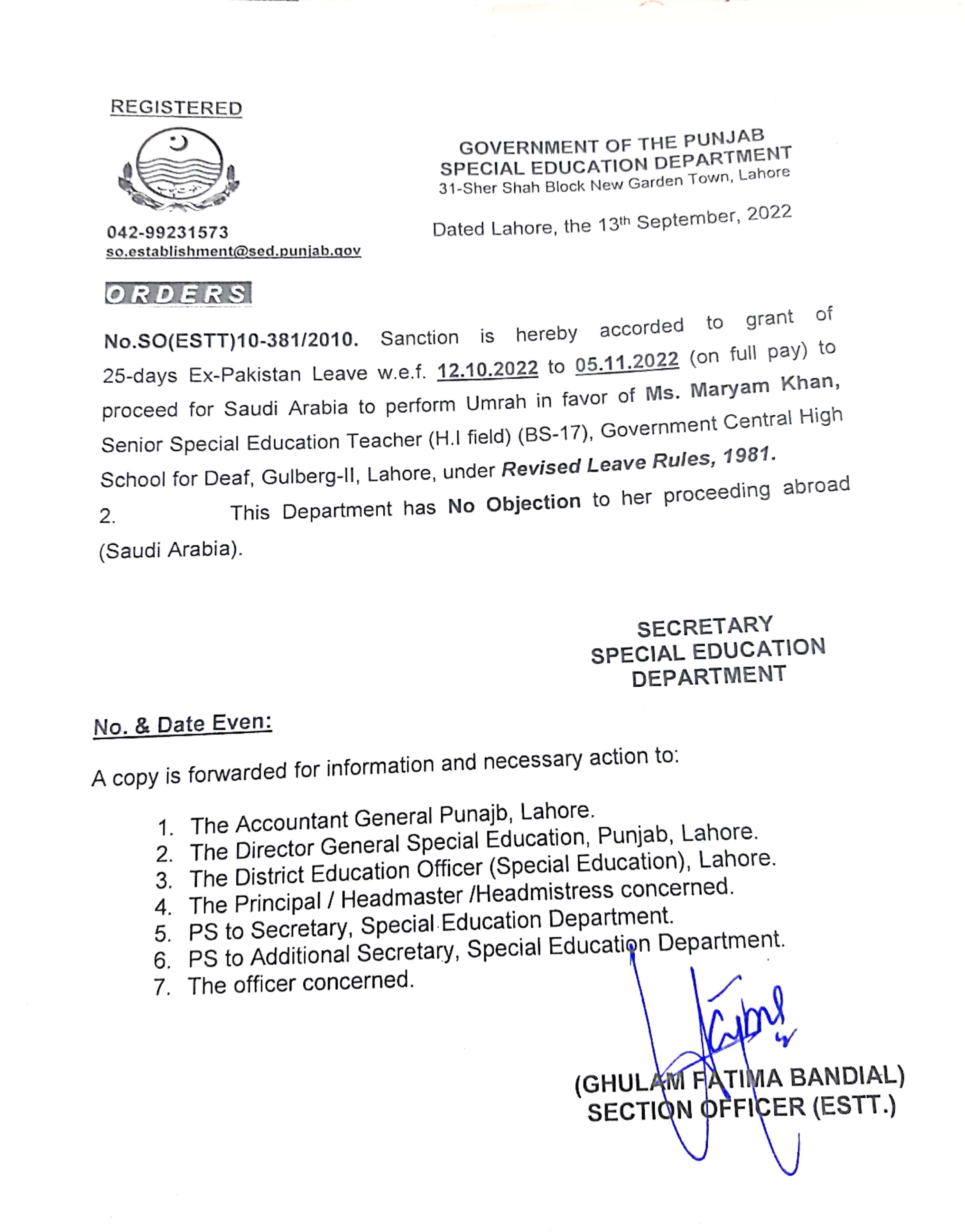 Category Leave Orders Date Thursday, September 15, 2022 - 12:00 Order No S0(ESTT.)10-381/2010 File New Doc 09-15-2022 13.24_page3_image1.jpg501.47 KB Employee Name Maryam Khan Prominent Notifications