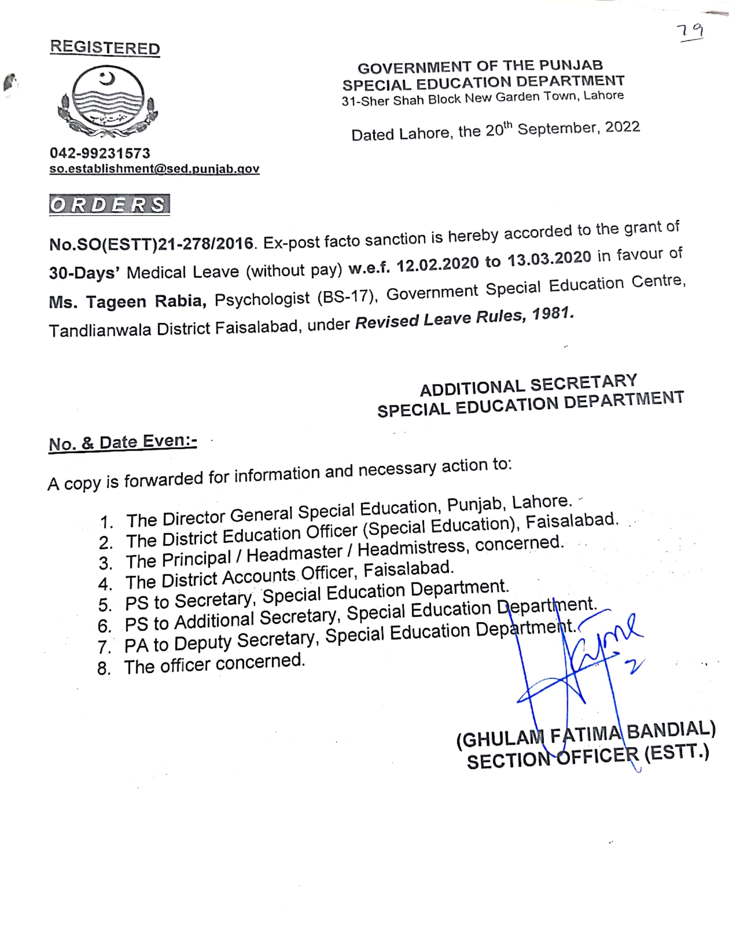 Category Leave Orders Date Friday, September 23, 2022 - 12:00 Order No S0(ESTT.)21-278/2016 File New Doc 09-23-2022 11.49_page9_image2.jpg555.21 KB Employee Name Tageen Rabia Prominent Notifications