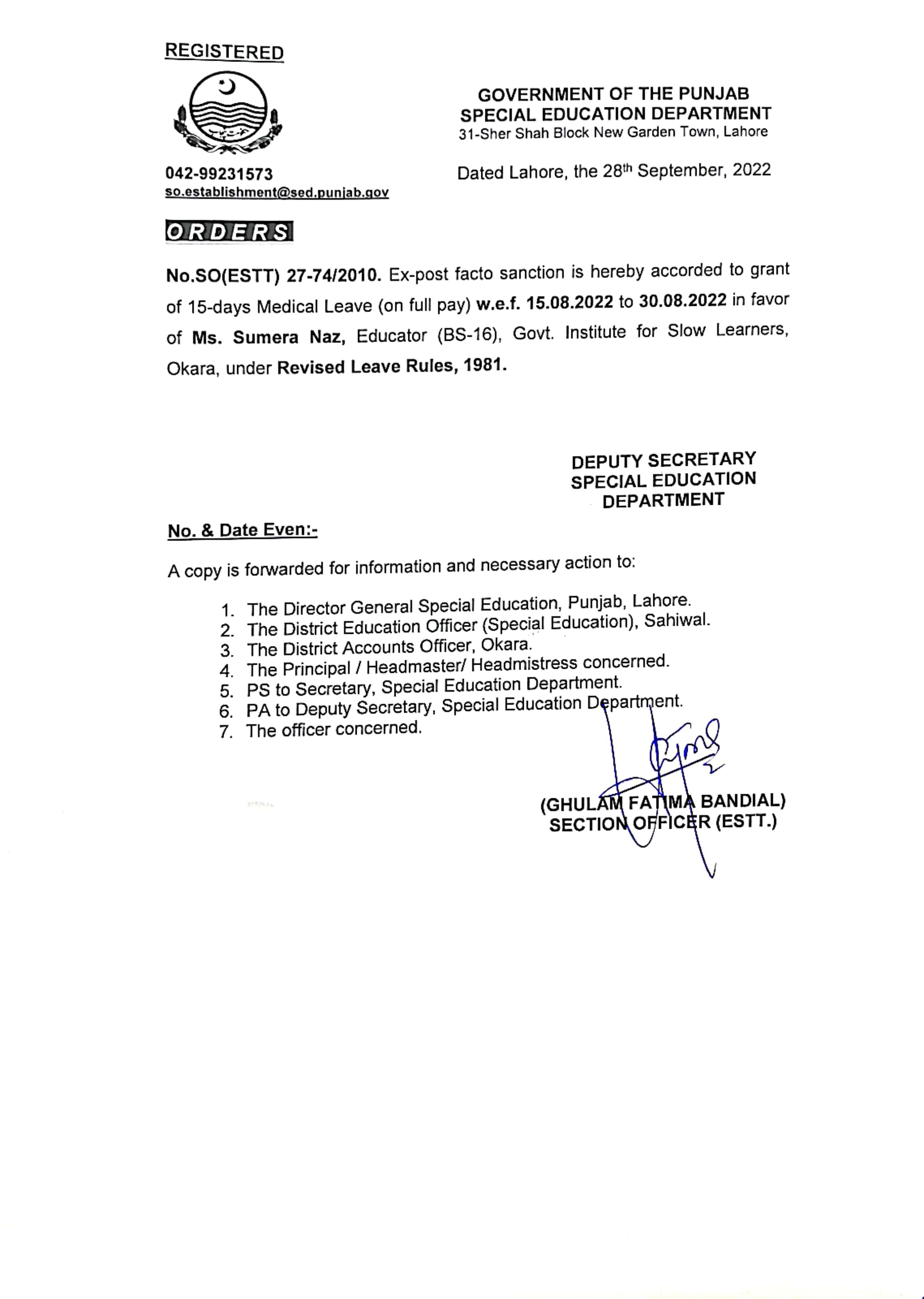 Category Leave Orders Date Friday, September 30, 2022 - 12:00 Order No S0(ESTT.)27-74/2010 File CamScanner 09-30-2022 14.51_page5_image4.jpg400.29 KB Employee Name Sumera Naz Prominent Notifications
