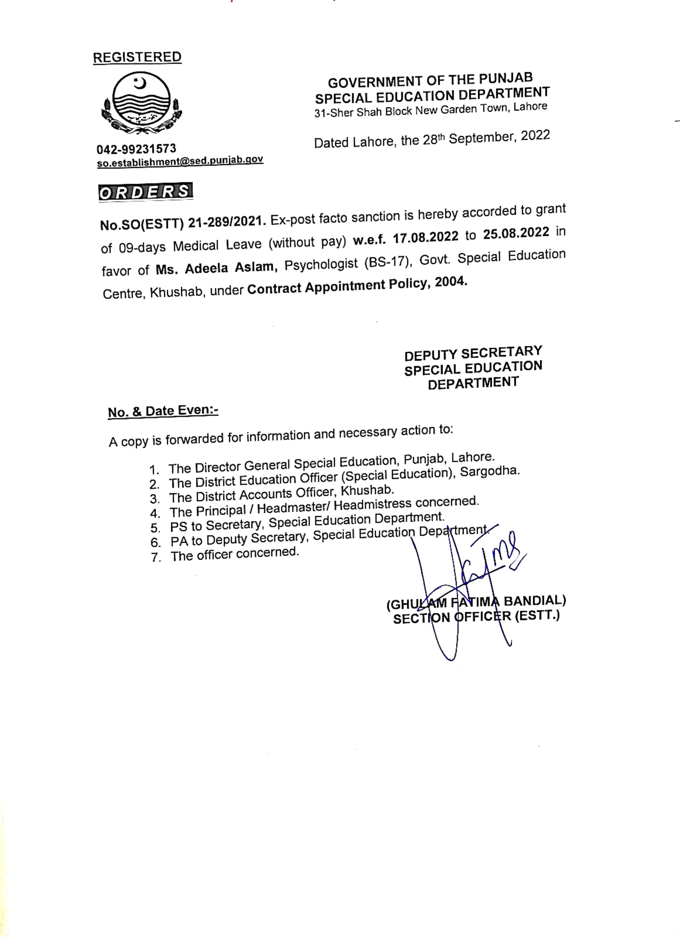 Category Leave Orders Date Friday, September 30, 2022 - 12:00 Order No S0(ESTT.)21-289/2021 File CamScanner 09-30-2022 14.51_page5_image5.jpg422.56 KB Employee Name Adeela Aslam Prominent Notifications