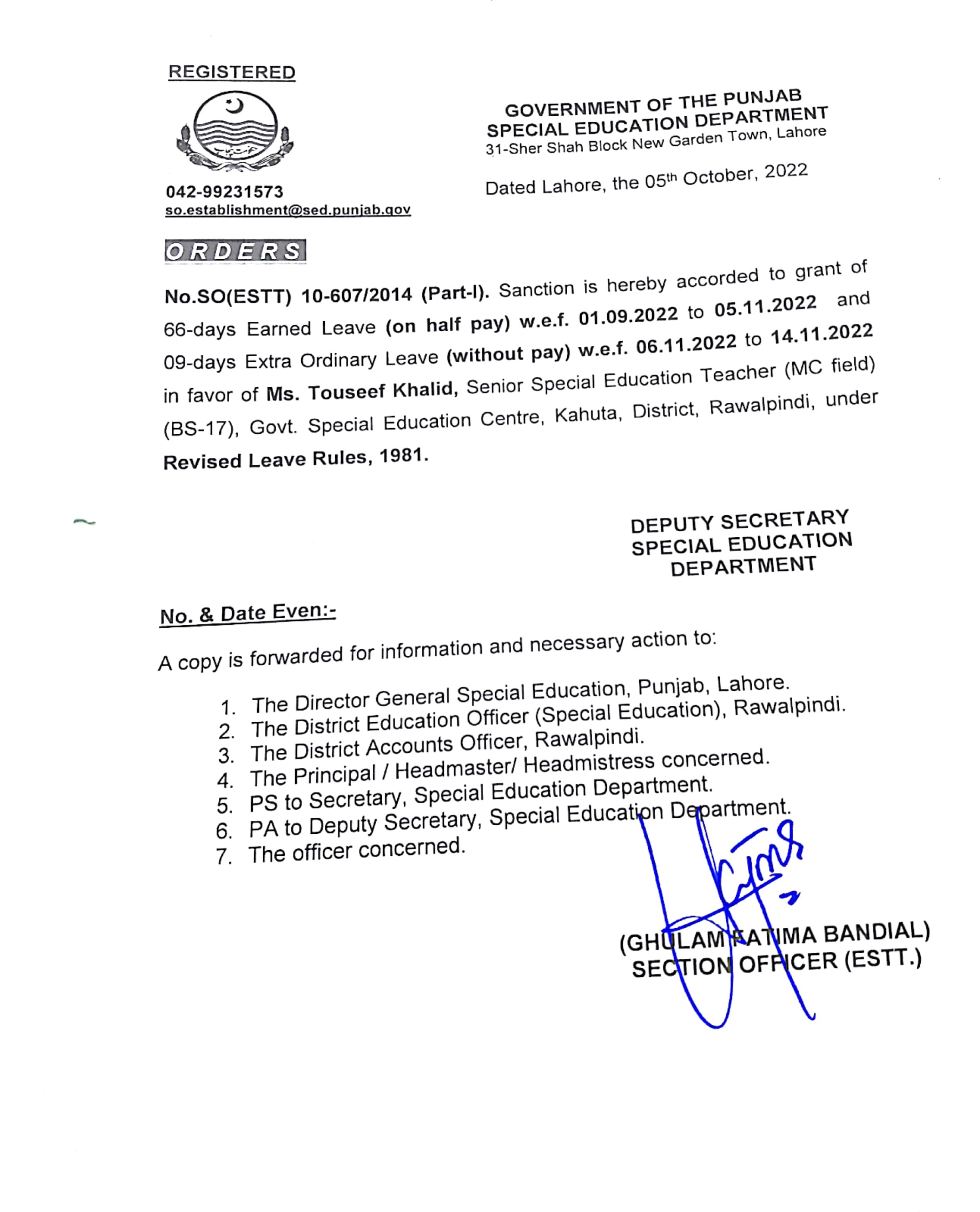Category Leave Orders Date Wednesday, October 5, 2022 - 12:00 Order No S0(ESTT.)10-607/2014 File New Doc 10-05-2022 15.50_page5_image2.jpg489.6 KB Employee Name Touseef Khalid Prominent Notifications