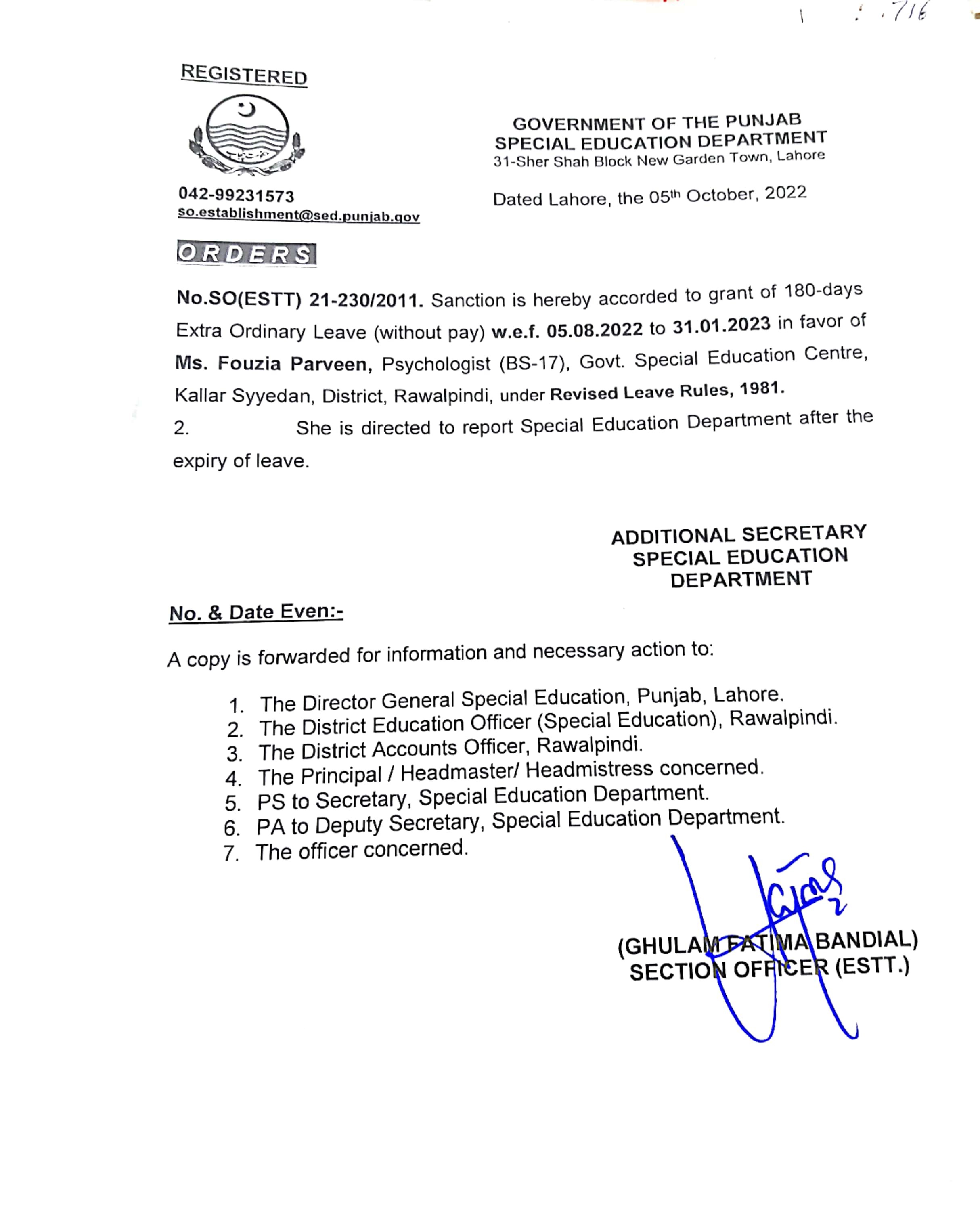 Category Leave Orders Date Wednesday, October 5, 2022 - 12:00 Order No vS0(ESTT.)21-230/2011 File New Doc 10-05-2022 15.50_page5_image4.jpg467.54 KB Employee Name Fouzia Parveen Prominent Notifications