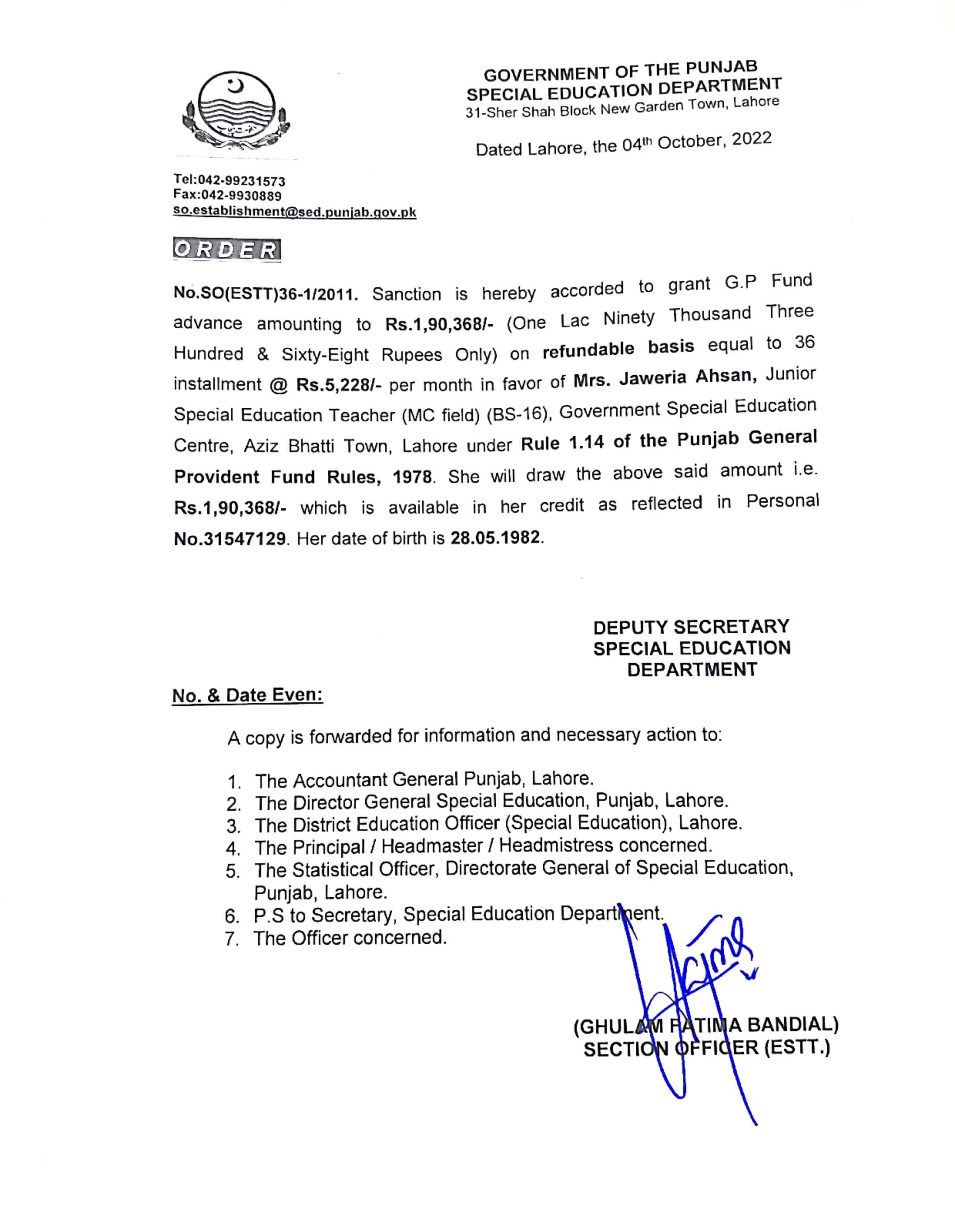 Category G.P Fund Advance Date Friday, October 7, 2022 - 12:00 Order No S0(ESTT.)36-1/2011 File New Doc 10-07-2022 11.37_page6_image6.jpg507.1 KB Employee Name Jaweria Ahsan Prominent Notifications