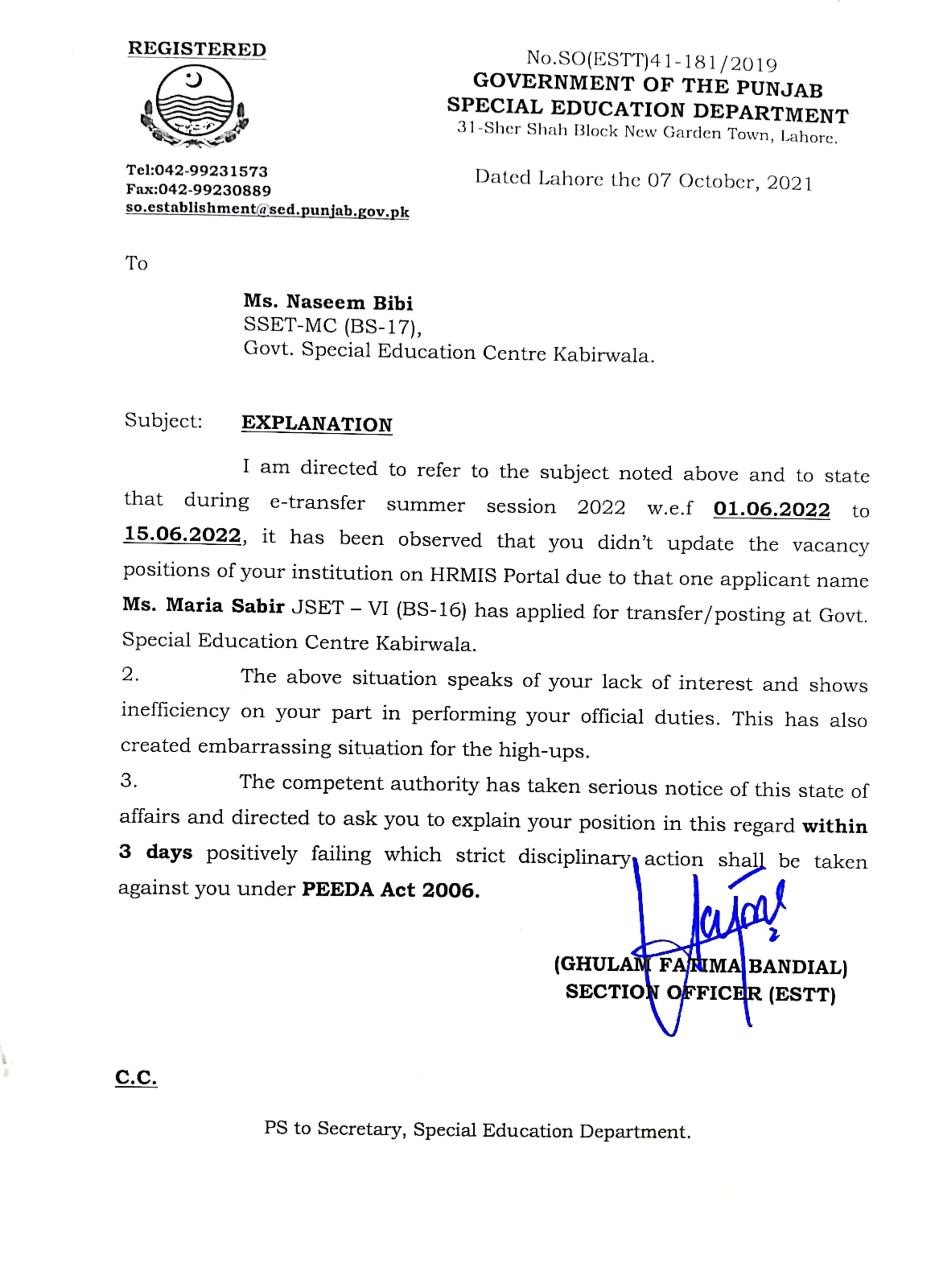 Category Explanations / Warnings Date Friday, October 7, 2022 - 12:00 Order No S0(ESTT.)41-181/2019 File CamScanner 10-10-2022 11.42_page3_image3.jpg553.58 KB Employee Name Naseem Bibi Prominent Notifications