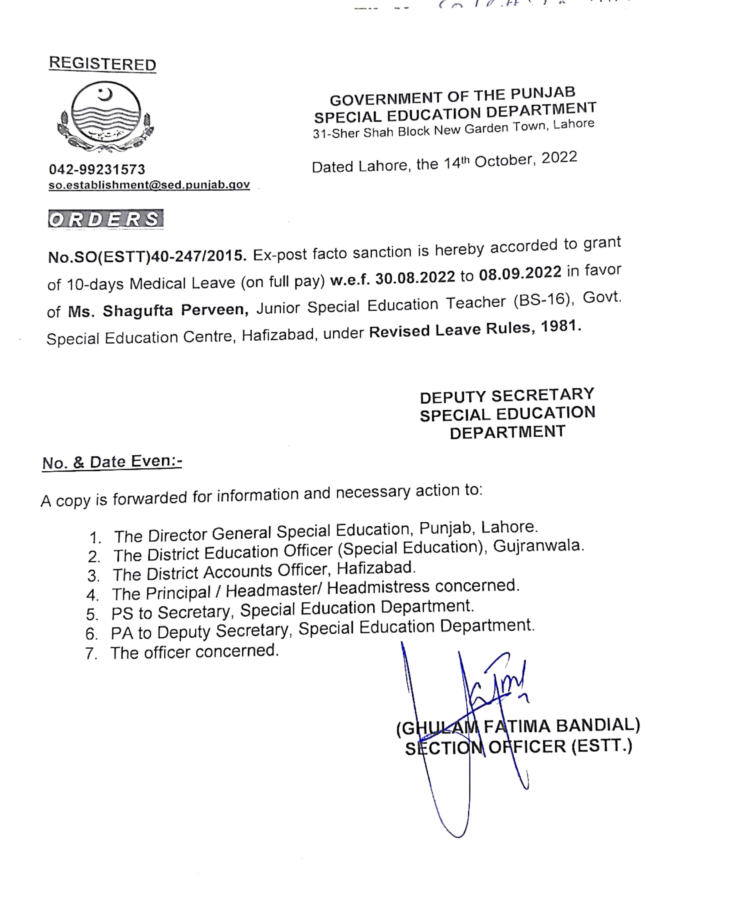Category Leave Orders Date Friday, October 14, 2022 - 12:00 Order No S0(ESTT.)40-333/2015 File New Doc 10-14-2022 15.10_page6_image4.jpg487.43 KB Employee Name Shagufta Parveen Prominent Notifications
