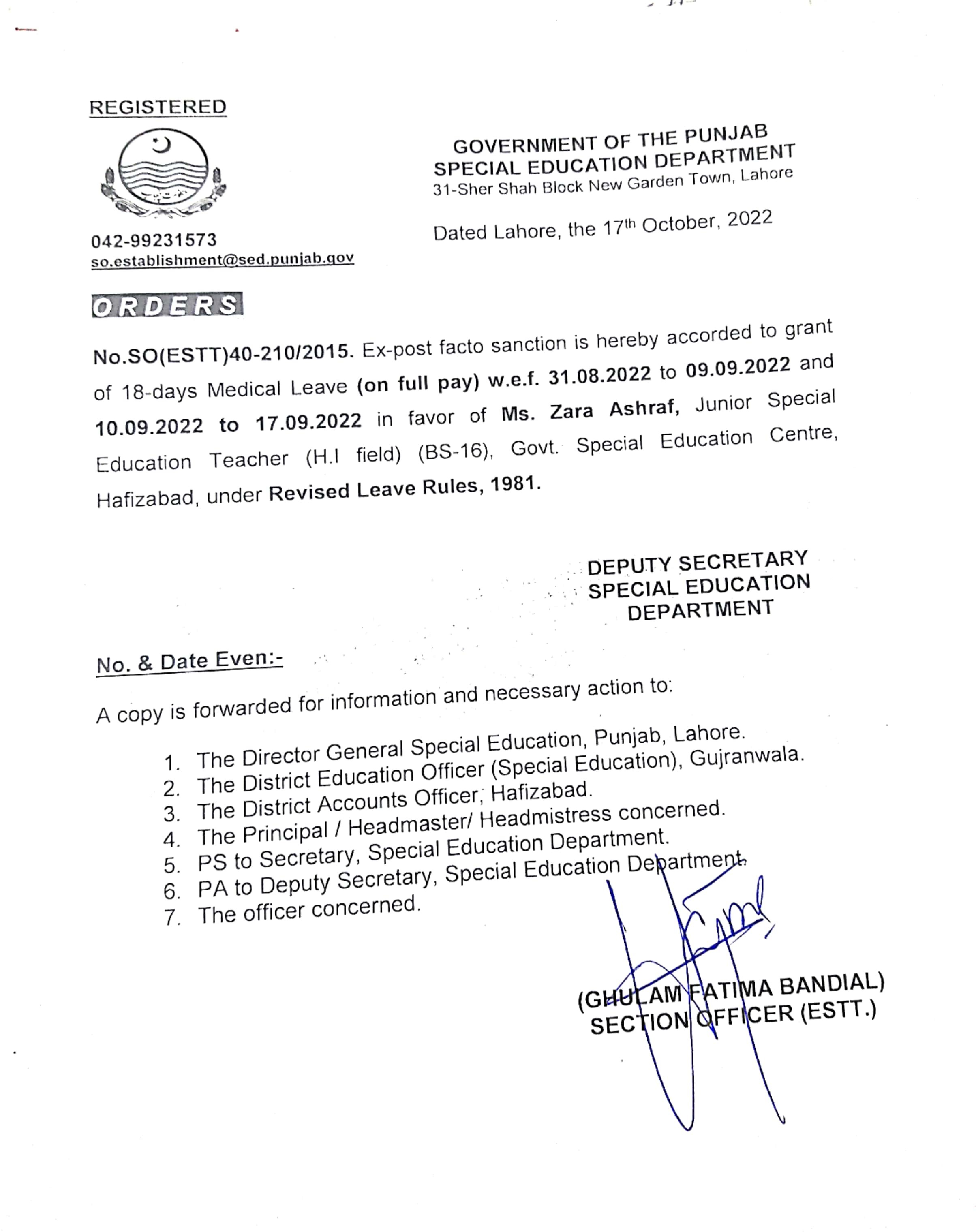 Category Leave Orders Date Monday, October 17, 2022 - 12:00 Order No S0(ESTT.)40-210/2015 File New Doc 10-17-2022 12.30_page2_image1.jpg473.52 KB Employee Name Zara Ashraf Prominent Notifications