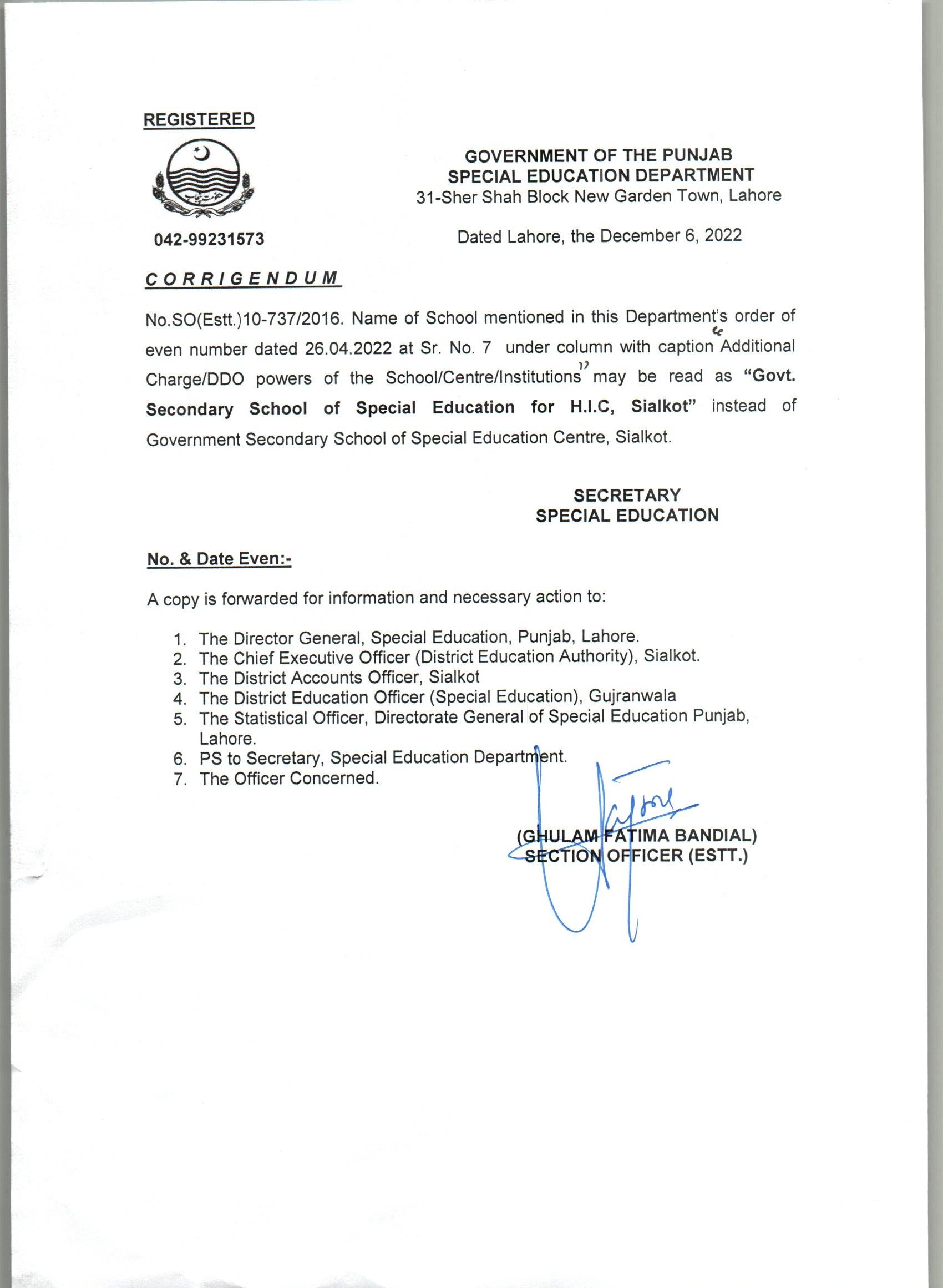 Govt. Secondary School of Special Education for H.I.C, Sialkot