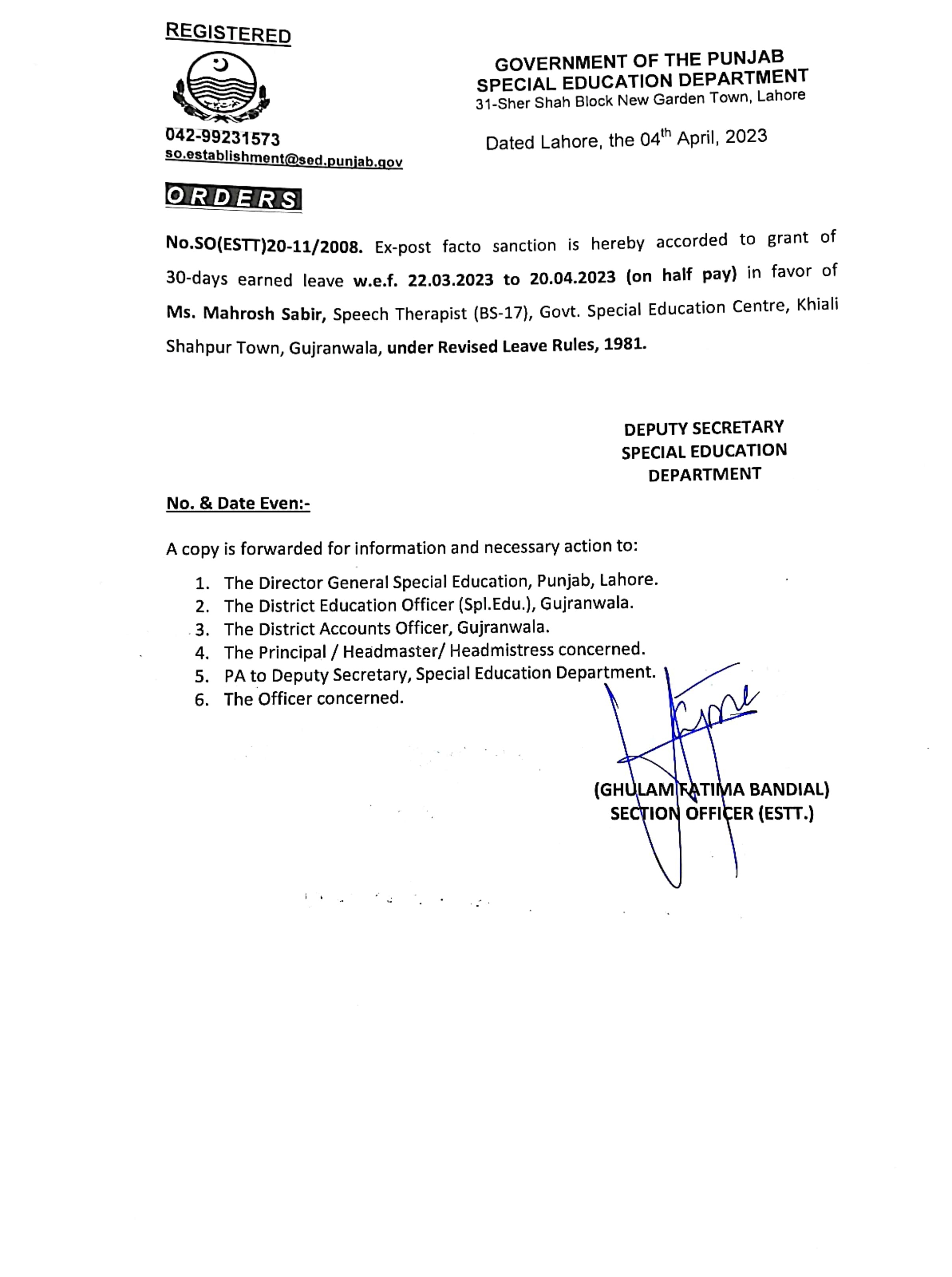 Category Leave Orders Date Monday, April 10, 2023 - 12:00 Order No S0(ESTT.)10-151/2019 File CamScanner 04-10-2023 09.37_page21_image18.jpg407.75 KB Employee Name Mahrosh Sabir Prominent Notifications