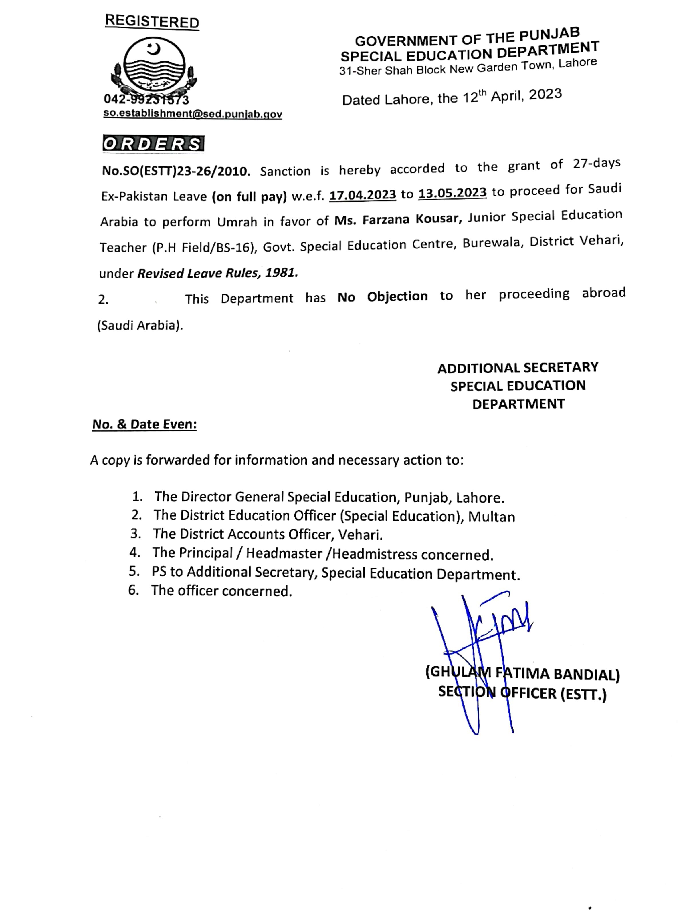 Category Leave Orders Date Wednesday, April 12, 2023 - 12:00 Order No S0(ESTT.)23-26/2010 File CamScanner 04-12-2023 15.34_page1_image1.jpg548.46 KB Employee Name Farzana Kousar Prominent Notifications