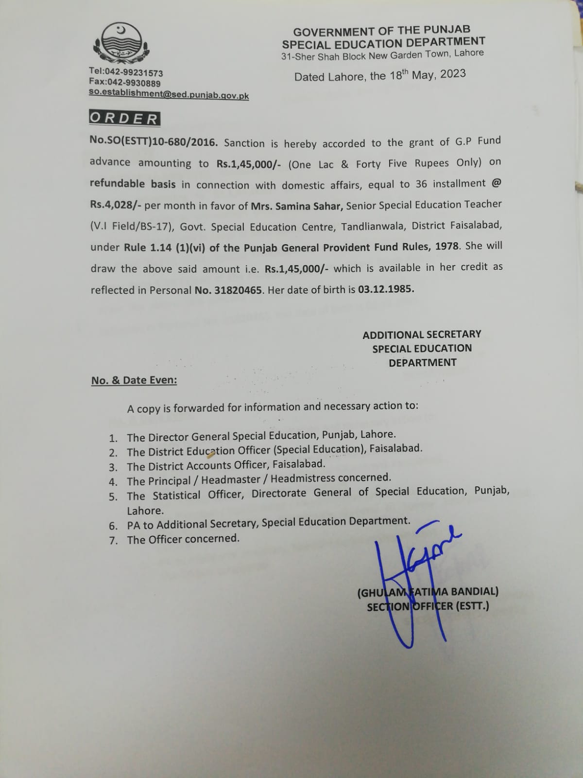 Category G.P Fund Advance Date Wednesday, May 24, 2023 - 12:00 Order No S0(ESTT.)10-680/2016 File WhatsApp Image 2023-05-22 at 12.03.02 PM.jpeg125.13 KB Employee Name Samina Sahar Prominent Notifications