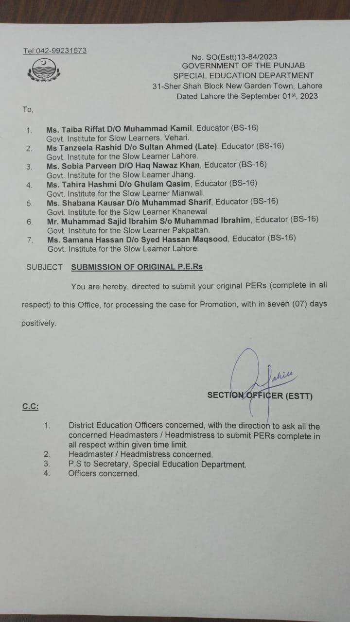 Category Promotion Orders Date Friday, September 1, 2023 - 12:00 Order No S0(ESTT.)13-84/2023 File WhatsApp Image 2023-09-01 at 4.37.12 PM.jpeg81.4 KB Employee Name Educators (BS-16) Prominent Notifications