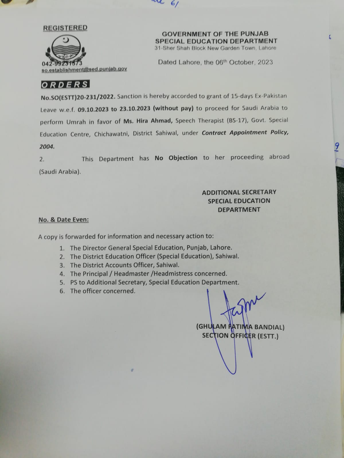 Category Leave Orders Date Friday, October 6, 2023 - 12:00 Order No S0(ESTT.)20-231/2022 File WhatsApp Image 2023-10-06 at 12.00.27 PM.jpeg99.01 KB Employee Name Hira Ahmad Prominent Notifications