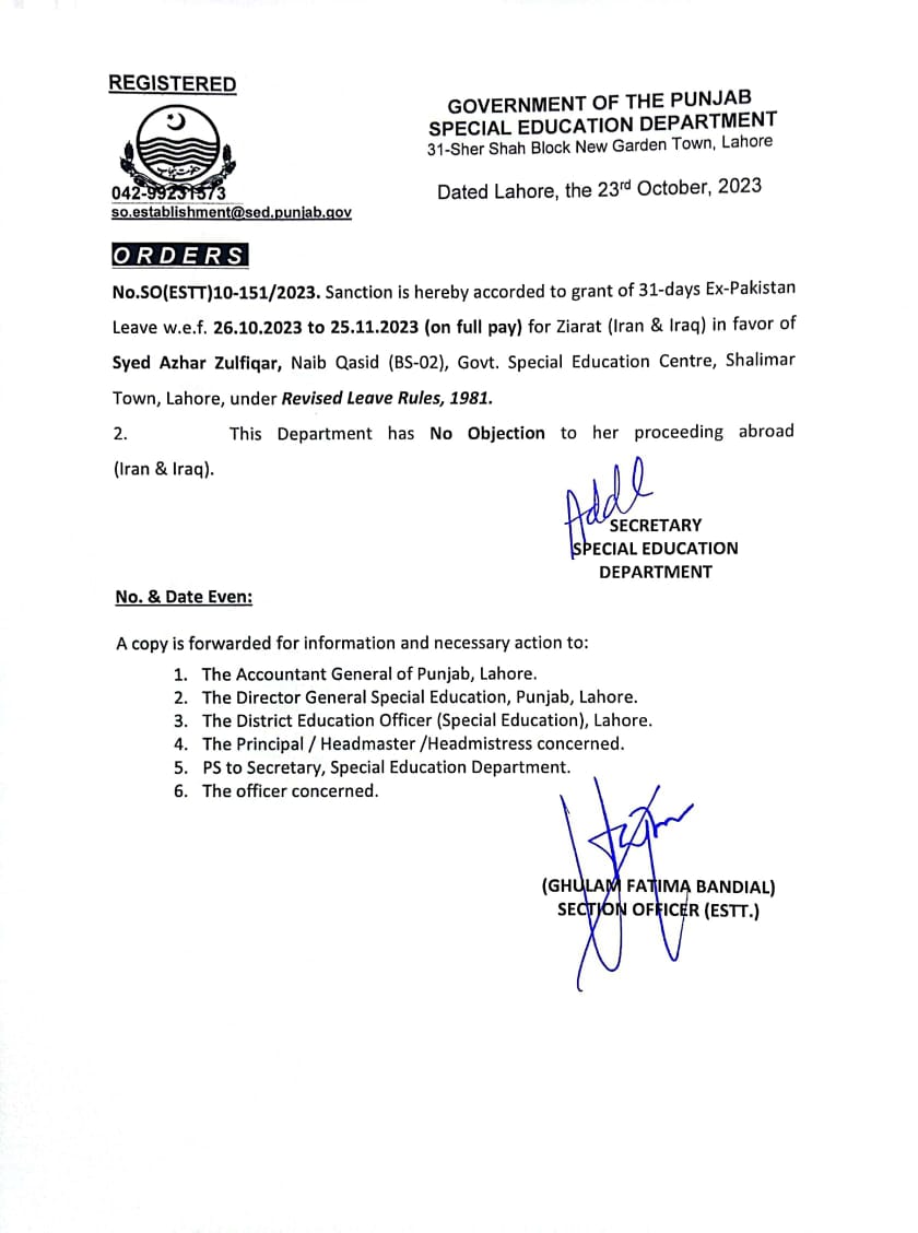 Category Leave Orders Date Monday, October 23, 2023 - 12:00 Order No S0(ESTT.)10-151/2023 File WhatsApp Image 2023-10-23 at 5.03.50 PM (2).jpeg73.89 KB Employee Name Syed Azhar Zulfiqar Prominent Notifications