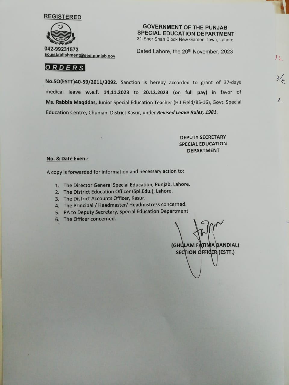 Category Leave Orders Date Monday, November 20, 2023 - 12:00 Order No S0(ESTT.)40-59/2011 File WhatsApp Image 2023-11-20 at 4.49.33 PM.jpeg75.96 KB Employee Name Rabia Maqddas Prominent Notifications