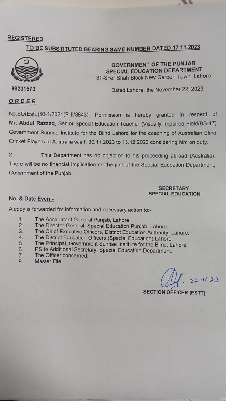 Category Departmental Permissions Date Wednesday, November 22, 2023 - 12:00 Order No S0(ESTT.)50-1/2021 File WhatsApp Image 2023-11-22 at 3.00.20 PM.jpeg82.54 KB Employee Name Abdul Razzaq Prominent Notifications