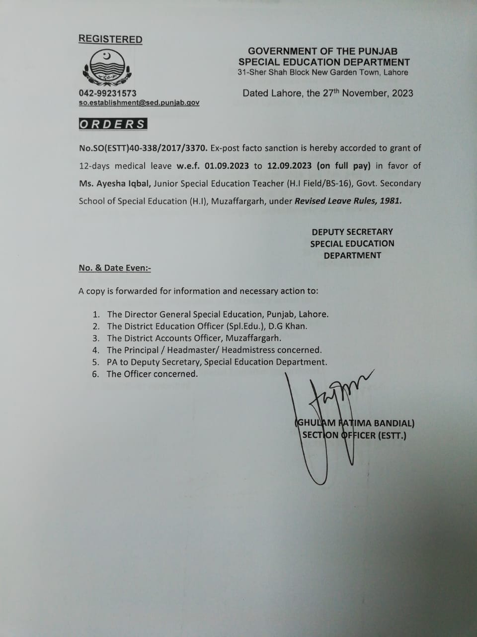 Category Leave Orders Date Monday, November 27, 2023 - 12:00 Order No S0(ESTT.)40-338/2017 File WhatsApp Image 2023-11-27 at 5.08.20 PM.jpeg78.92 KB Employee Name Ayesha Iqbal Prominent Notifications