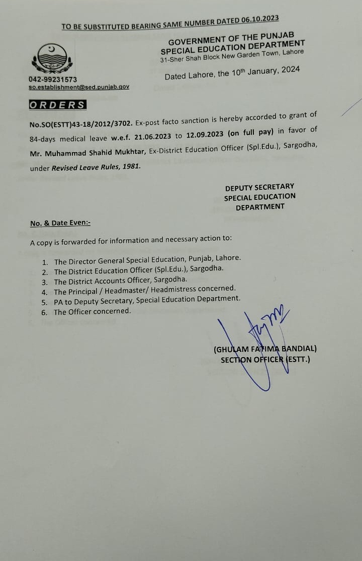 Category Leave Orders Date Thursday, January 11, 2024 - 12:00 Order No S0(ESTT.)43-18/2012 File WhatsApp Image 2024-01-11 at 1.06.33 PM.jpeg144.32 KB Employee Name Shahid Mukhtar Prominent Notifications
