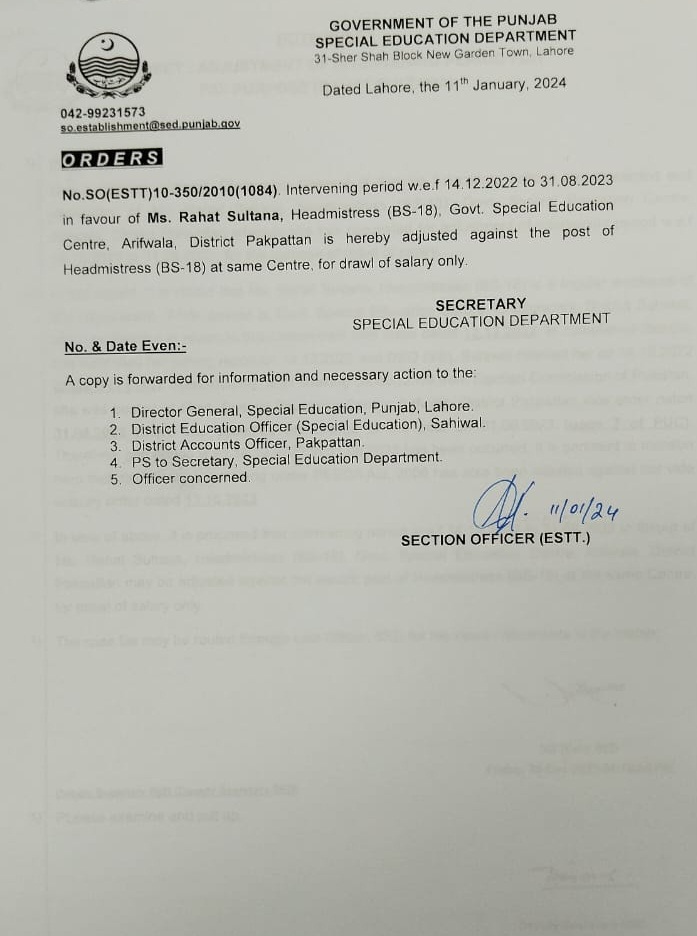 Category Others Date Thursday, January 11, 2024 - 12:00 Order No S0(ESTT.)10-350/2010 File WhatsApp Image 2024-01-11 at 2.08.08 PM.jpeg122.48 KB Employee Name Rahat Sultana Prominent Notifications