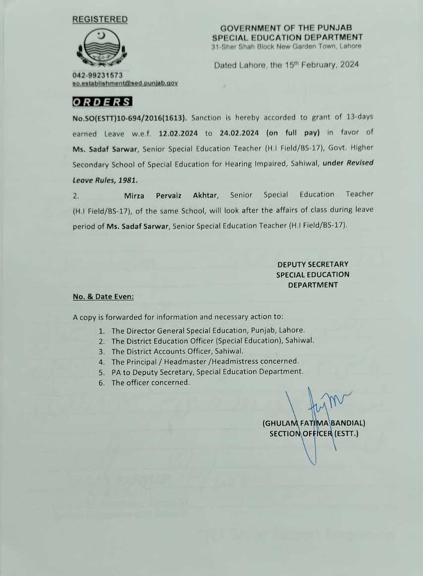 Category Leave Orders Date Thursday, February 15, 2024 - 12:00 Order No S0(ESTT.)10-694/2016 File WhatsApp Image 2024-02-15 at 4.55.48 PM.jpeg181.04 KB Employee Name Sadaf Sarwar Prominent Notifications