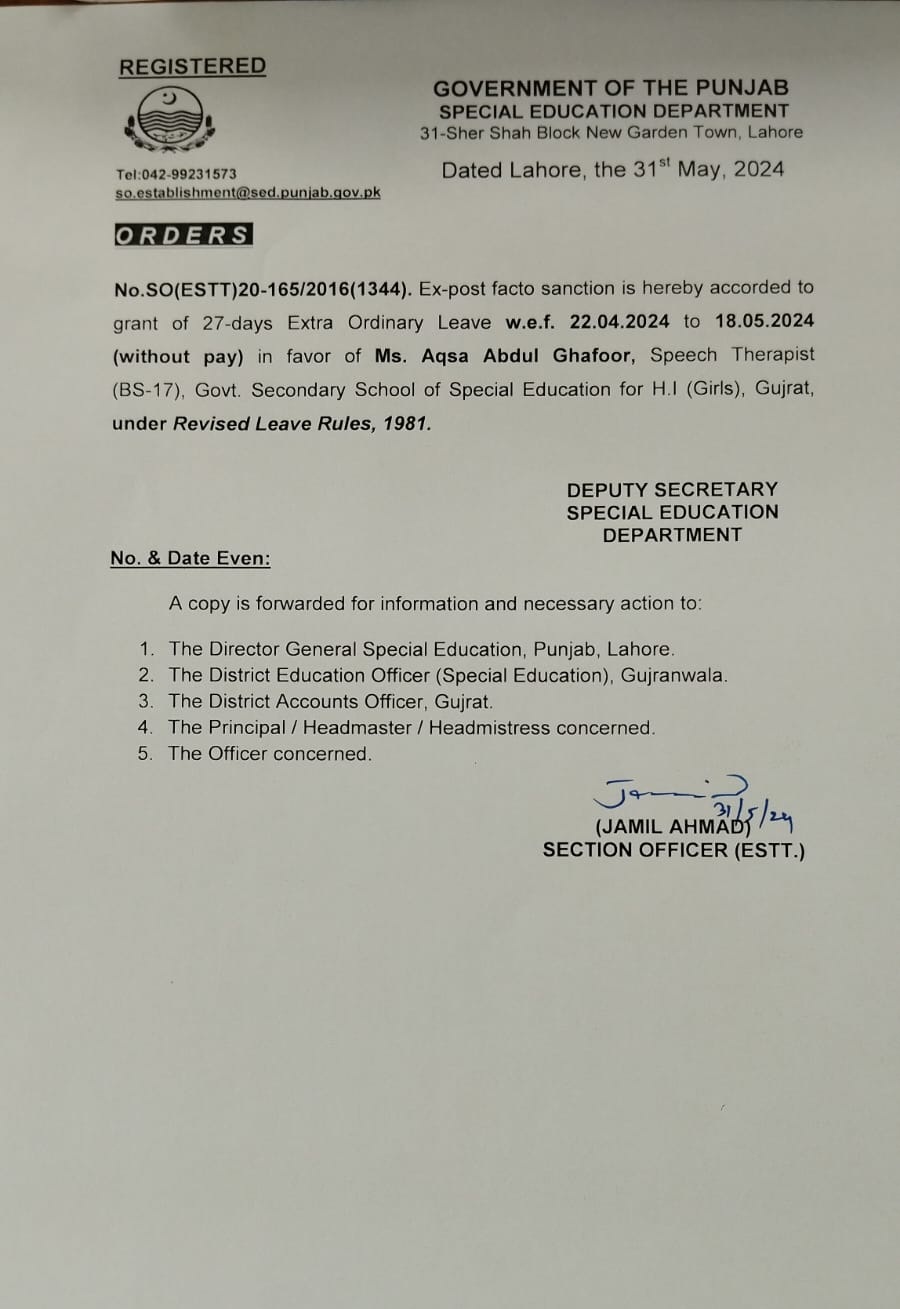 Category Leave Orders Date Friday, May 31, 2024 - 12:00 Order No S0(ESTT.)21-165/2016 File WhatsApp Image 2024-06-03 at 9.37.15 AM.jpeg142.69 KB Employee Name Aqsa Abdul Ghafoor Prominent Notifications