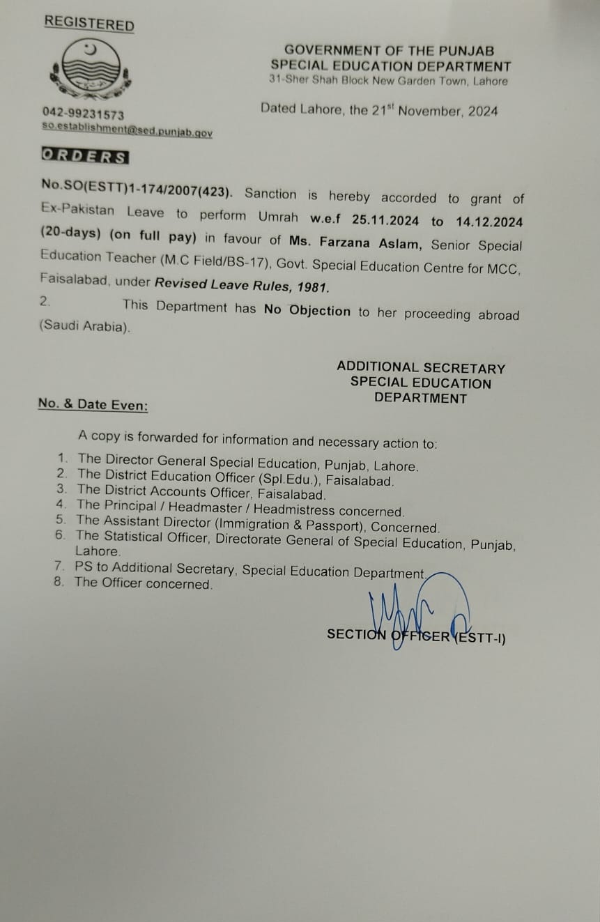 Category Leave Orders Date Thursday, November 21, 2024 - 12:00 Order No S0(ESTT.)1-174/2007 File WhatsApp Image 2024-11-21 at 4.08.24 PM (1).jpeg147.72 KB Employee Name Farzana Aslam Prominent Notifications