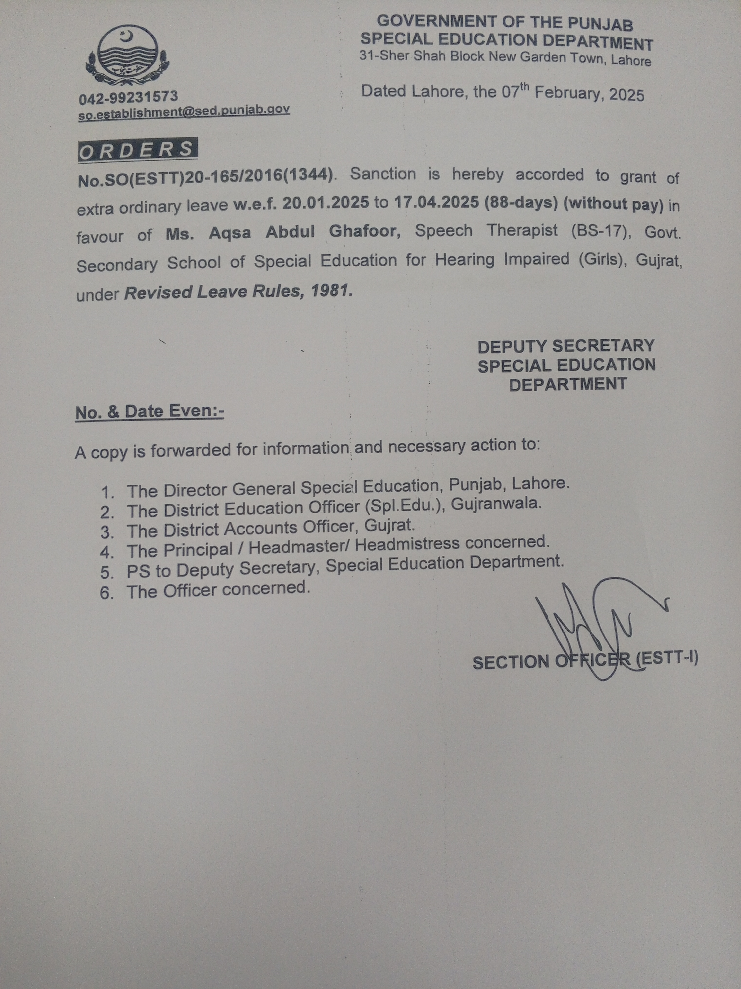 Category Leave Orders Date Friday, February 7, 2025 - 12:00 Order No SO(ESTT.)20-165/2016 File 17389279586653916725982260277151.jpg3.4 MB Employee Name Aqsa Abdul Ghafoor Prominent Notifications