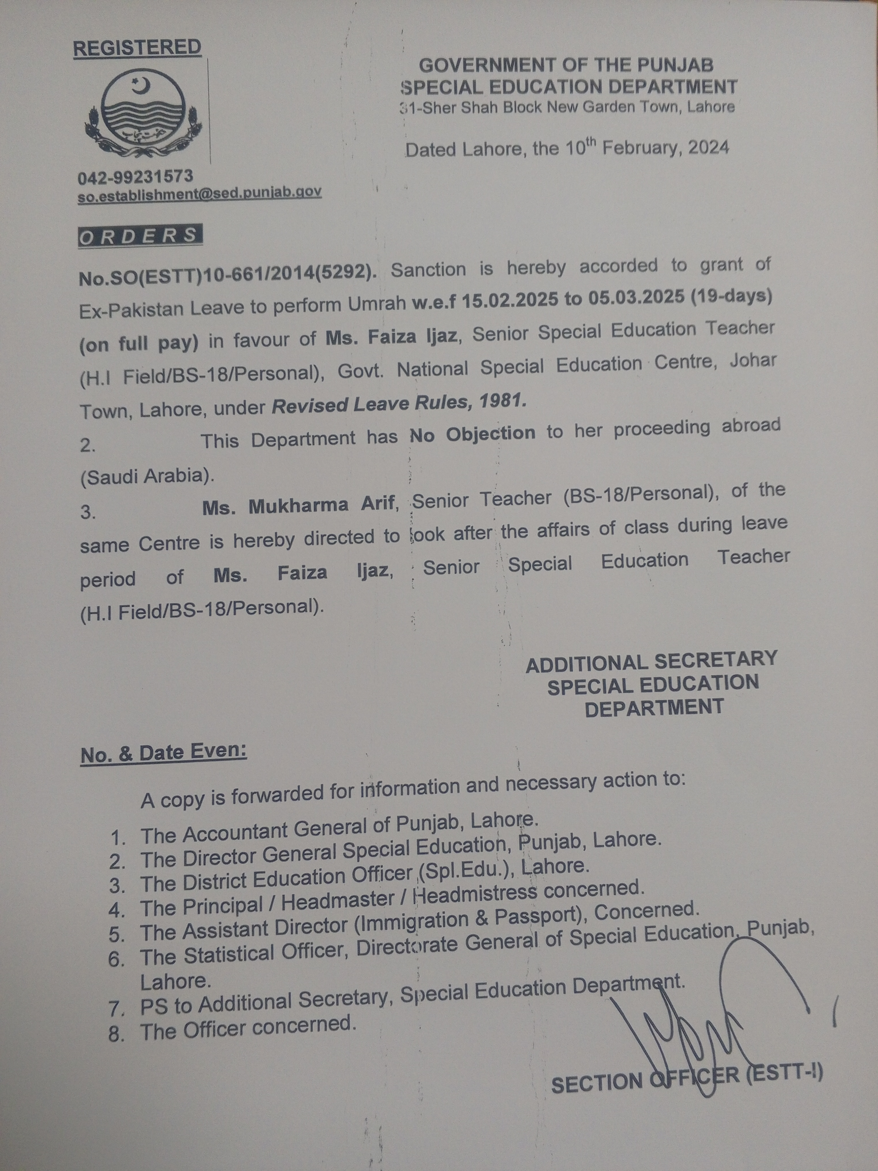 Category Leave Orders Date Monday, February 10, 2025 - 12:00 Order No SO(ESTT.)10-661/2014 File 17391813888563065850396768582572.jpg3.69 MB Employee Name Faiza Ijaz Prominent Notifications