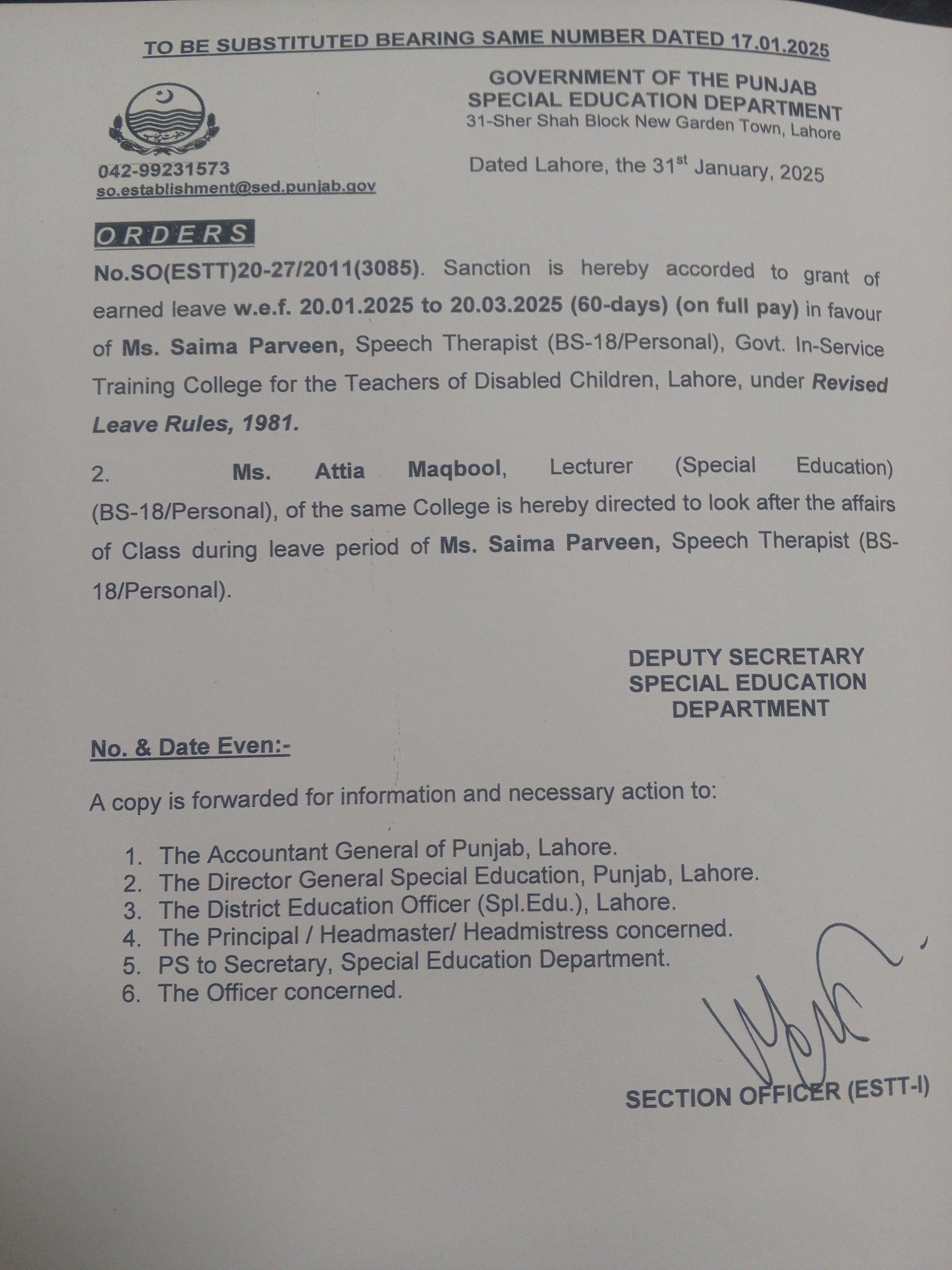Category Leave Orders Date Monday, February 10, 2025 - 12:00 Order No SO(ESTT.)20-27/2011 File 17391817914492732288088319866837.jpg3.7 MB Employee Name Saima Parveen Prominent Notifications