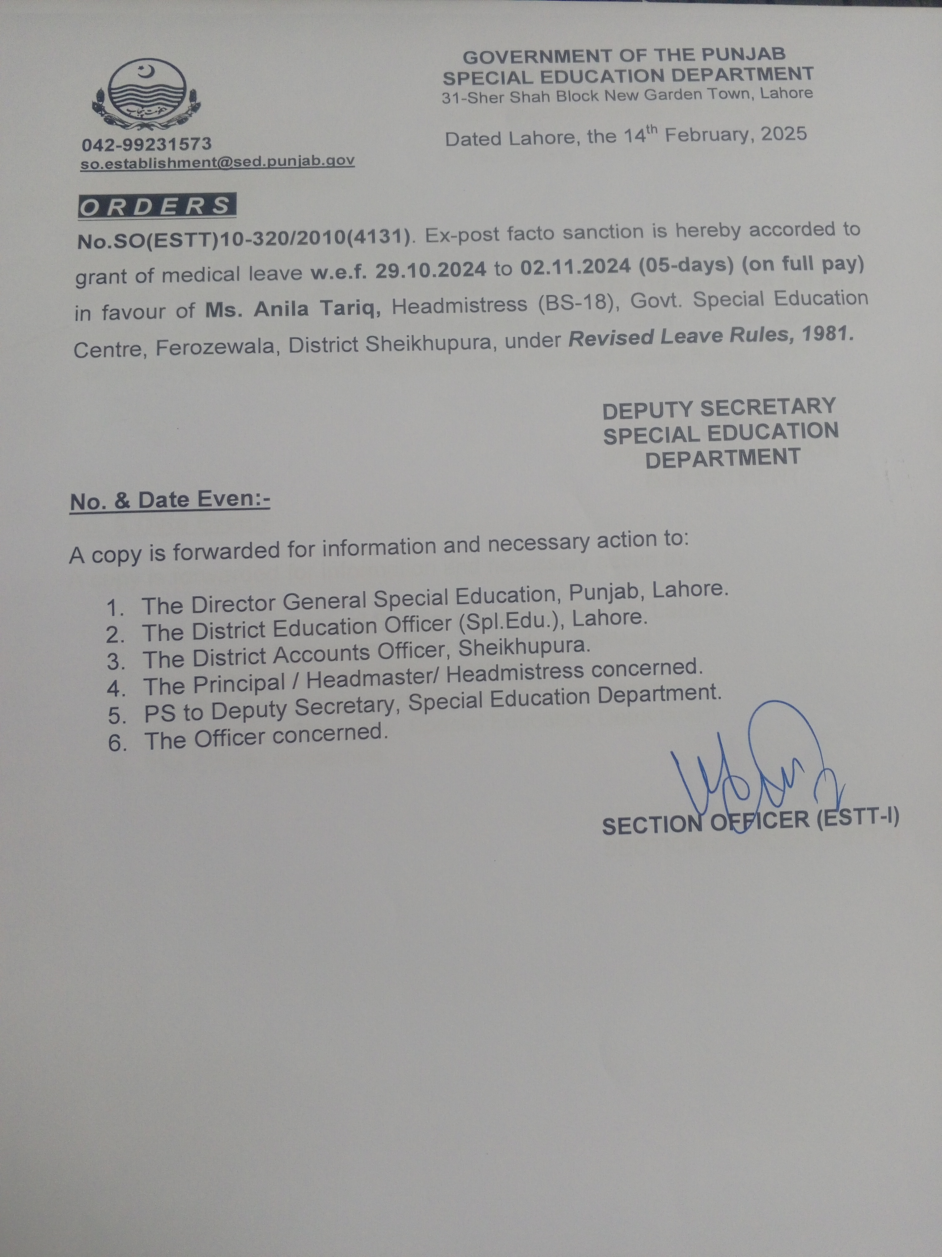 Category Leave Orders Date Friday, February 14, 2025 - 12:00 Order No SO(ESTT.)10-320/2010 File 17395330086661610219333486189521.jpg3.42 MB Employee Name Anila Tariq Prominent Notifications