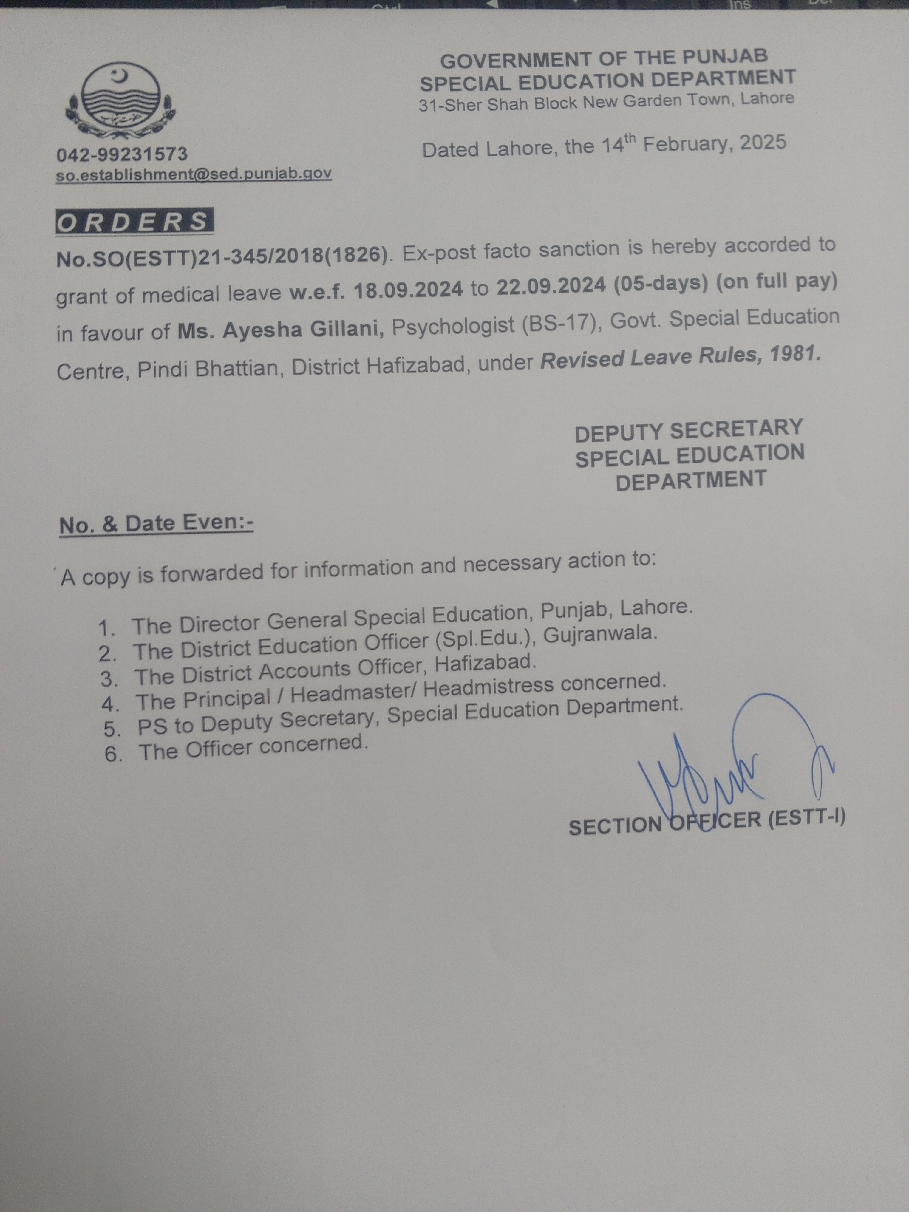 Category Leave Orders Date Friday, February 14, 2025 - 12:00 Order No SO(ESTT.)21-345/2018 File 17395331955396012734334011953024.jpg3.25 MB Employee Name Ayesha Gillani Prominent Notifications