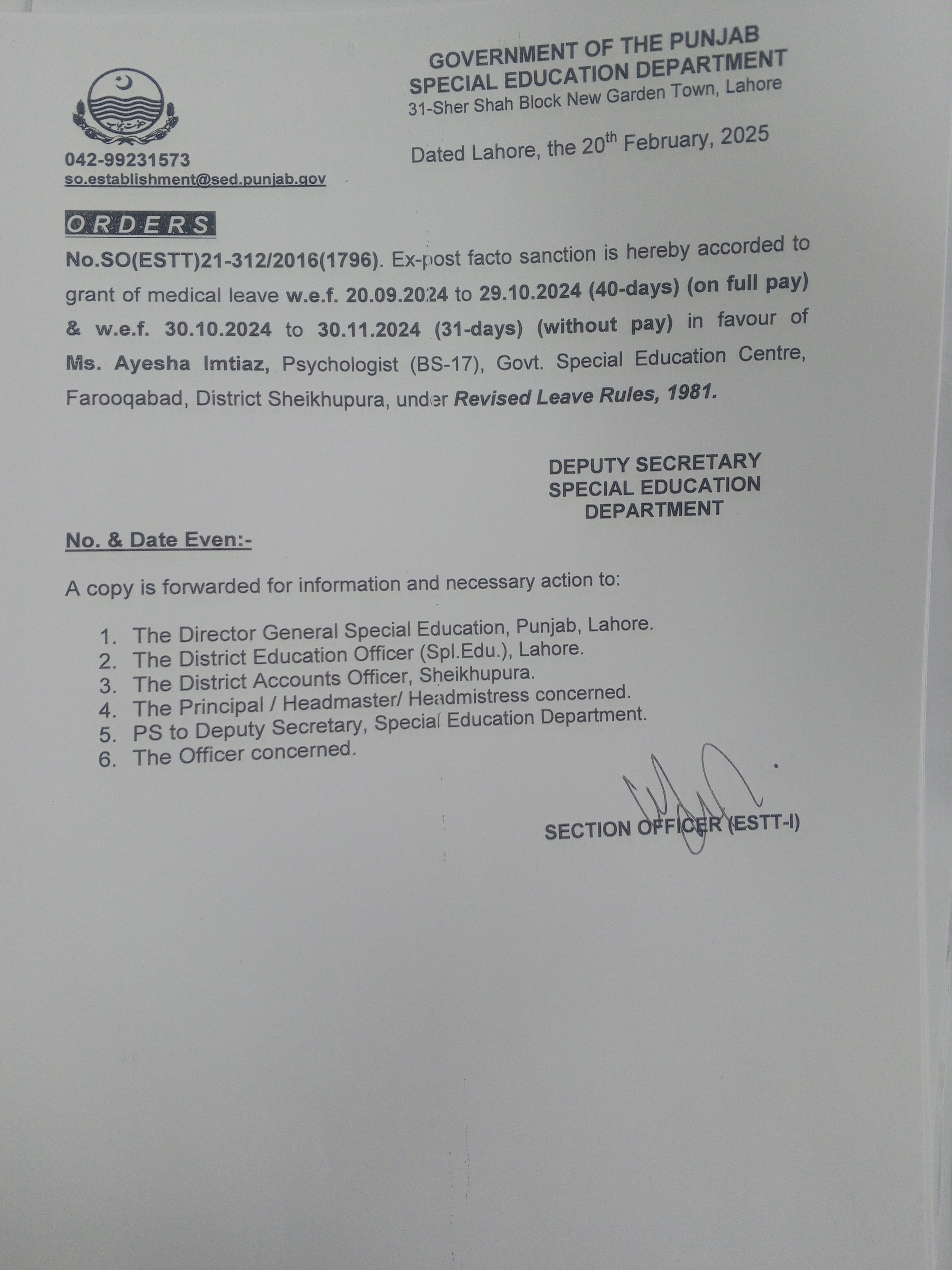 Category Leave Orders Date Monday, February 24, 2025 - 12:00 Order No SO(ESTT.)21-312/2016 File 17404633747054699276701956292296.jpg3.46 MB Employee Name Ayesha Imtiaz Prominent Notifications