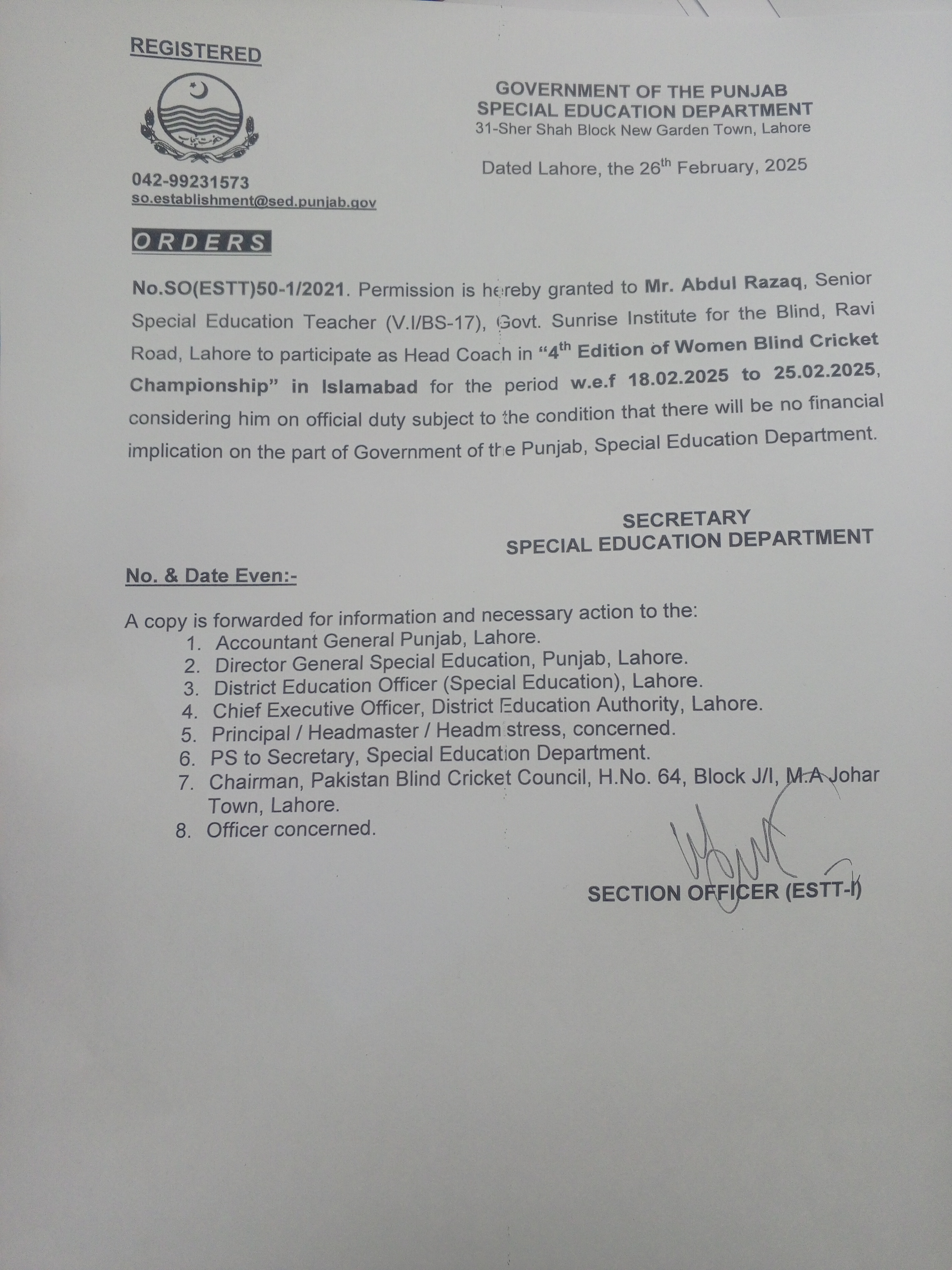 Category Departmental Permissions Date Wednesday, February 26, 2025 - 12:00 Order No SO(ESTT.)50-1/2021 File 17406313415672103536733468592016.jpg3.37 MB Employee Name Abdul Razaq Prominent Notifications
