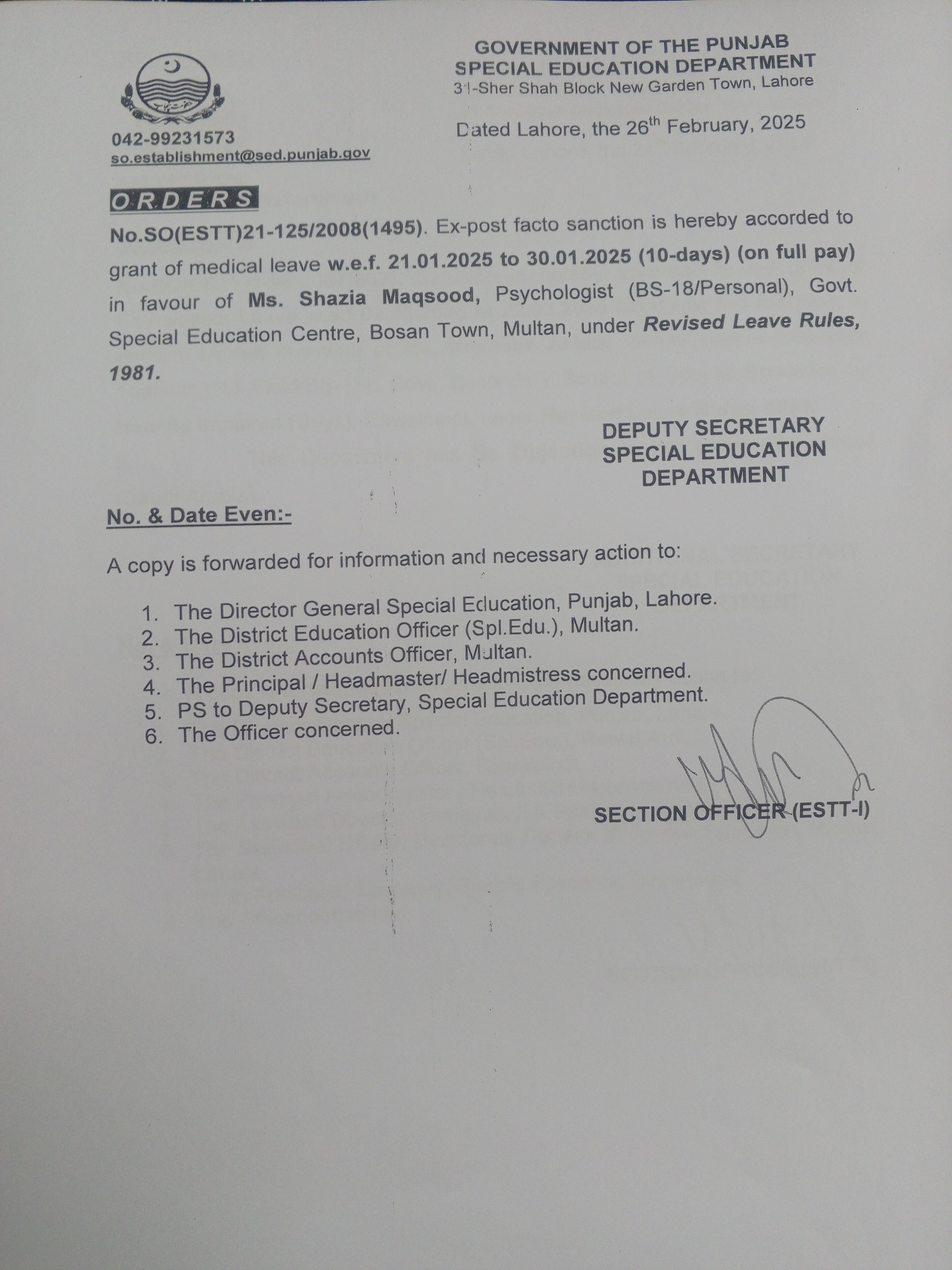 Category Leave Orders Date Wednesday, February 26, 2025 - 12:00 Order No SO(ESTT.)21-125/2008 File 17406422762688593247973316181125.jpg3.25 MB Employee Name Shazia Maqsood Prominent Notifications