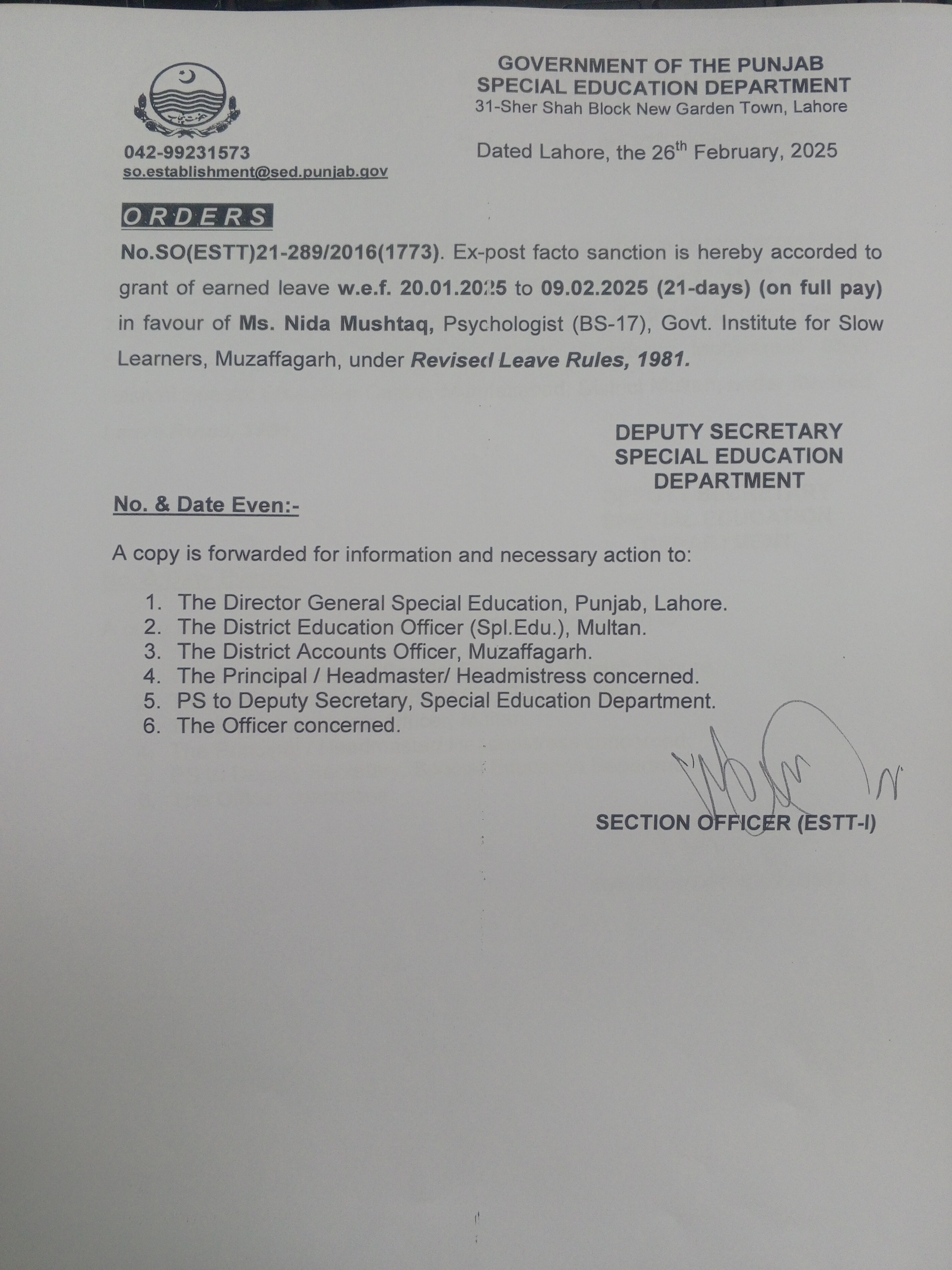 Category Leave Orders Date Wednesday, February 26, 2025 - 12:00 Order No SO(ESTT.)21-289/2016 File 17406424863673378733508256269416.jpg3.34 MB Employee Name Nida Mushtaq Prominent Notifications