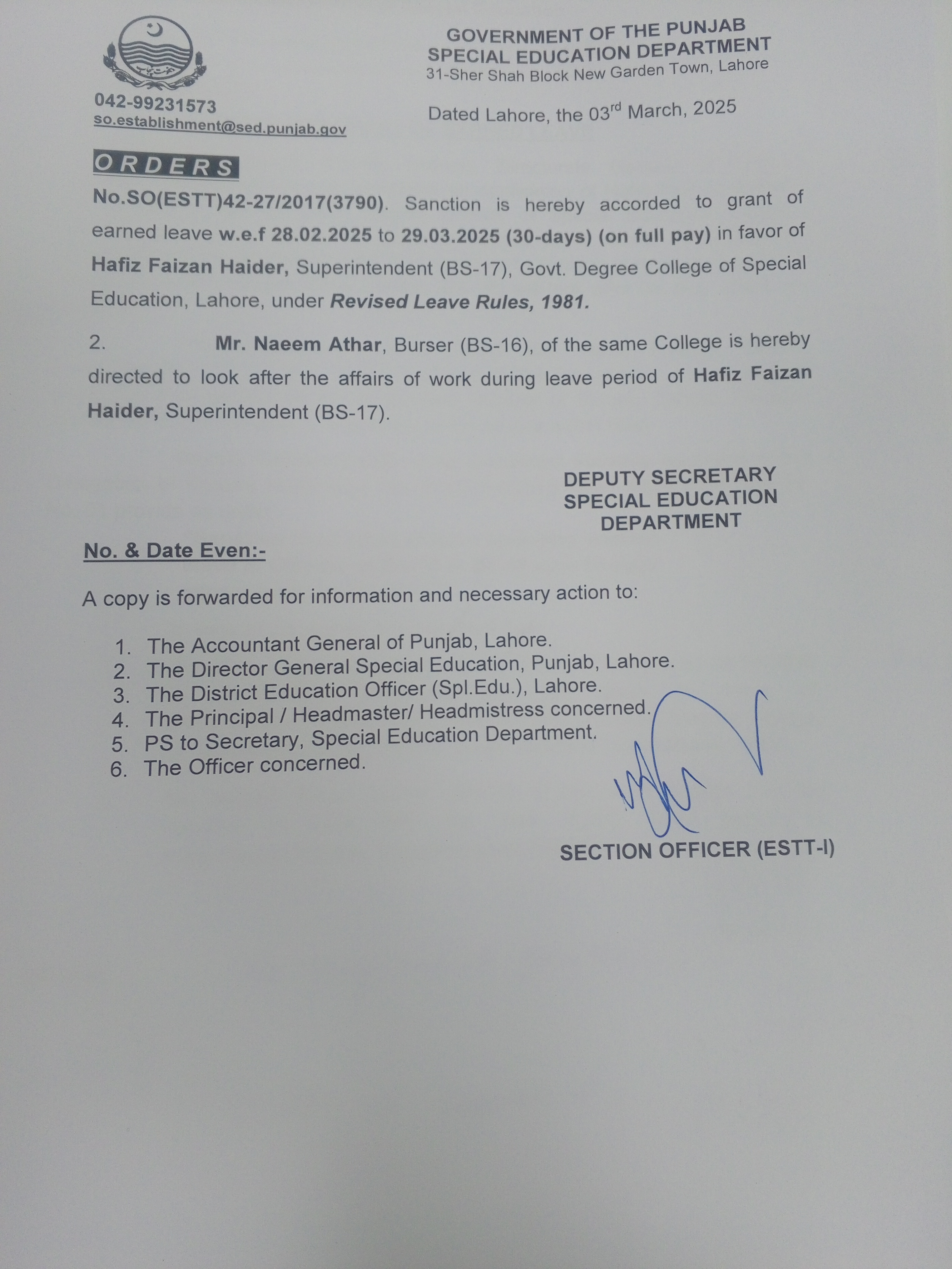 Category Leave Orders Date Monday, March 3, 2025 - 12:00 Order No SO(ESTT.)42-27/2017 File 17409942177246551241247505519812.jpg3.25 MB Employee Name Hafiz Faizan Haider Prominent Notifications